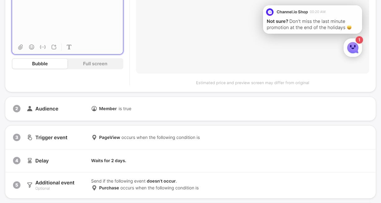 [Marketing] → [Campaign] → [+New campaign] → [Message via Channel Talk] → Set [Trigger event], [Delay], and [Additional event]
