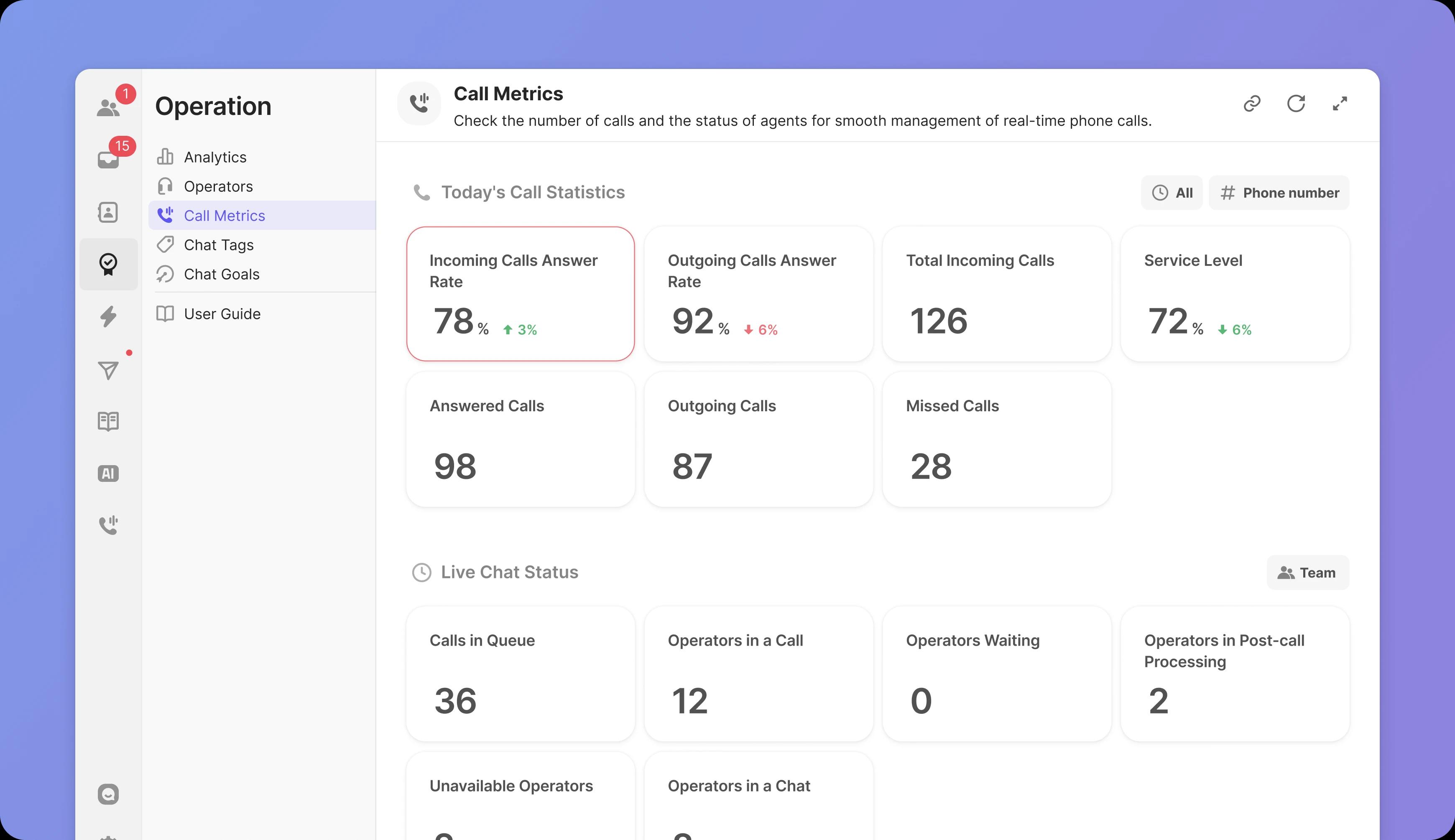 Call metrics like answer rate and calls in queue updated every minute.