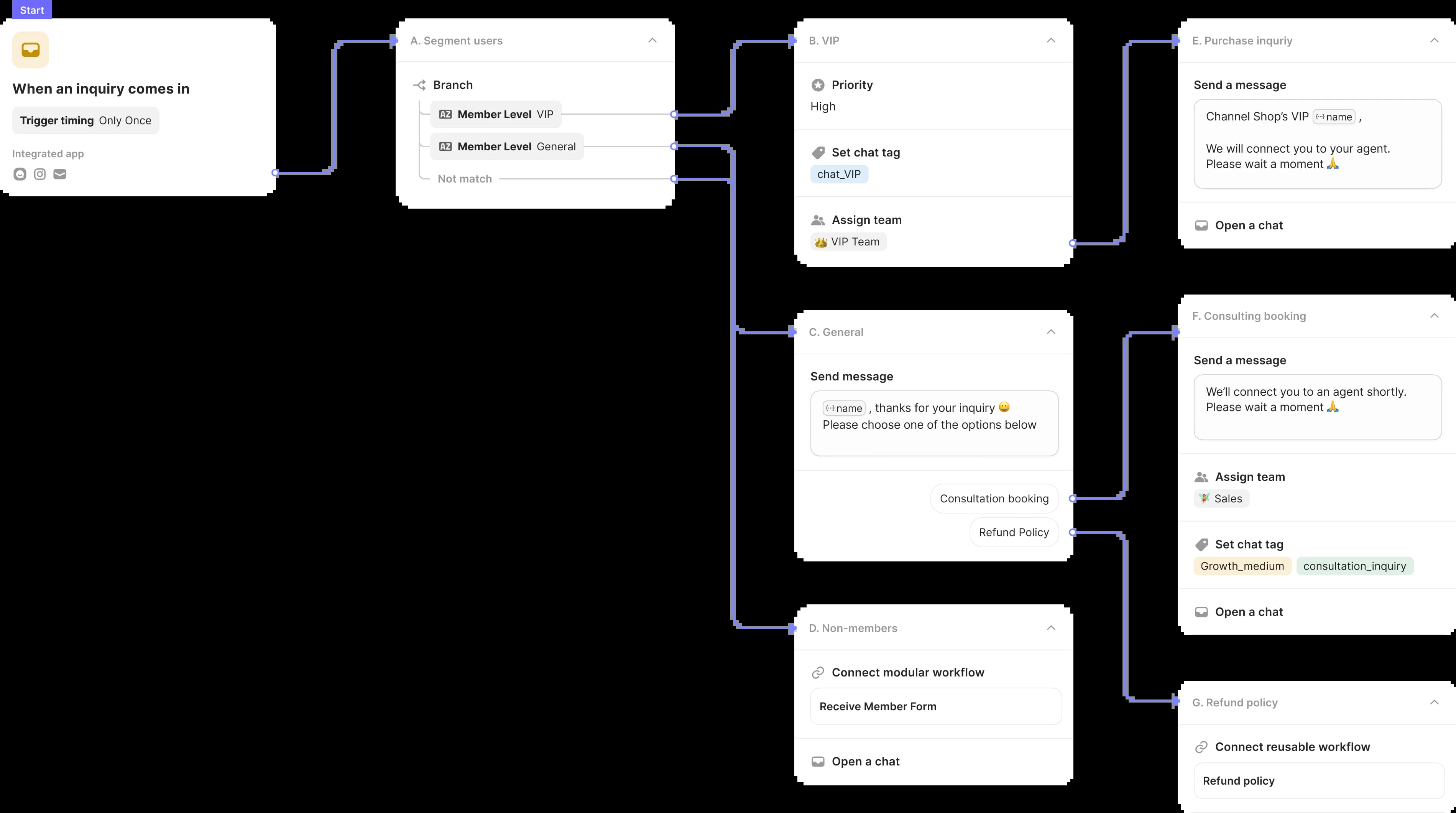 Automatically activate chatbots, apply tags, and assign teammates based on customer status and inquiry type.