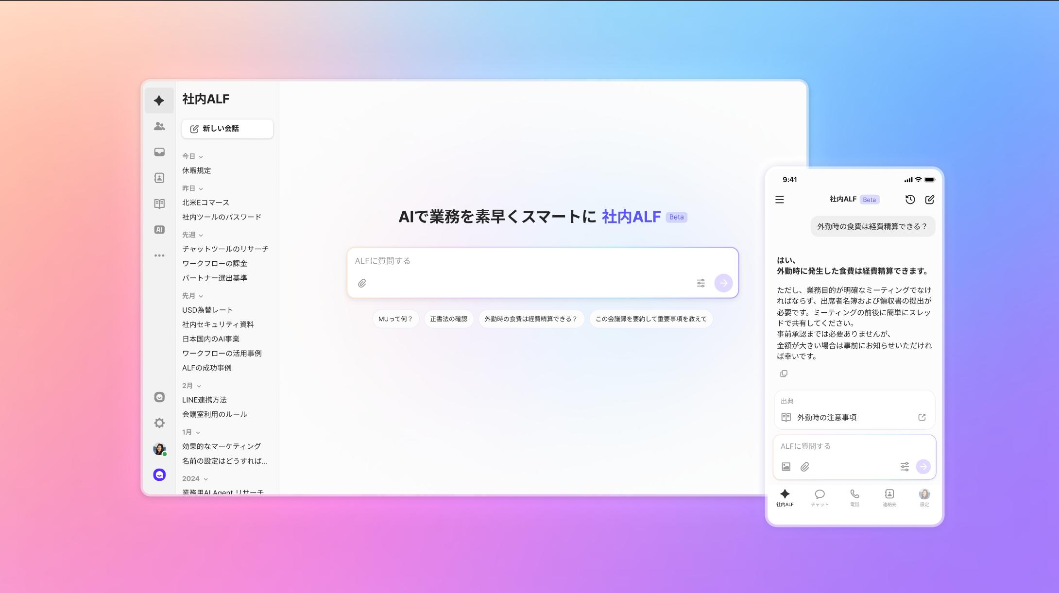 全社のお知らせから社内ルールまで、社内ALFで簡単に確認しましょう。 経費精算・ツールのログイン方法・各種申請など、細かい質問もAIに気軽に質問が可能です。