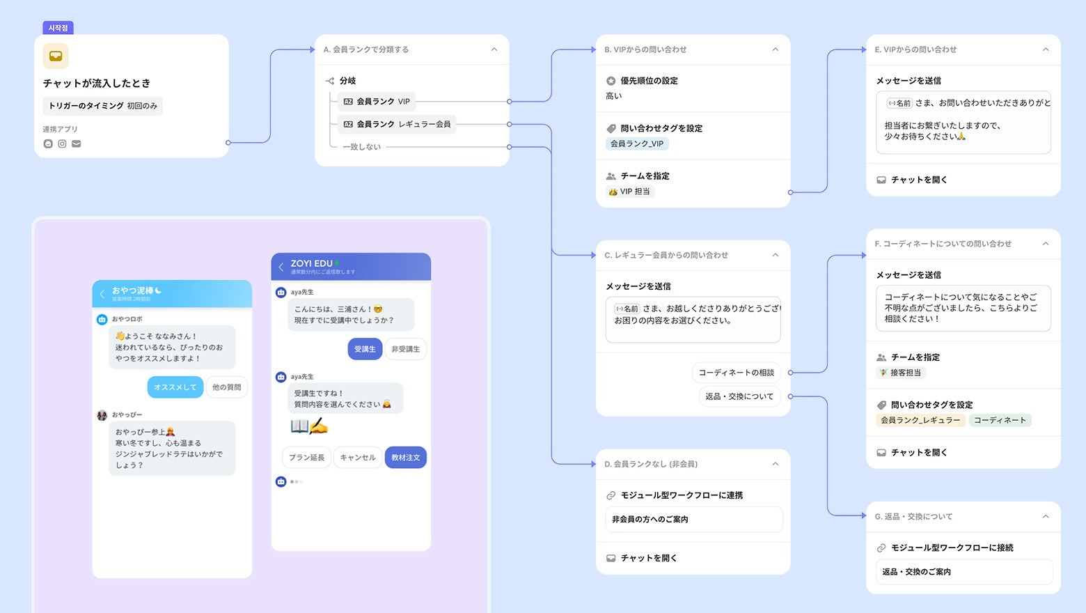 チャットの効果をさらに引き上げるのが、ワークフロー(自動化)です。問い合わせの初動から案内、担当者への振り分けまでを仕組み化することで、「速さ」と「品質」を同時に改善できます。