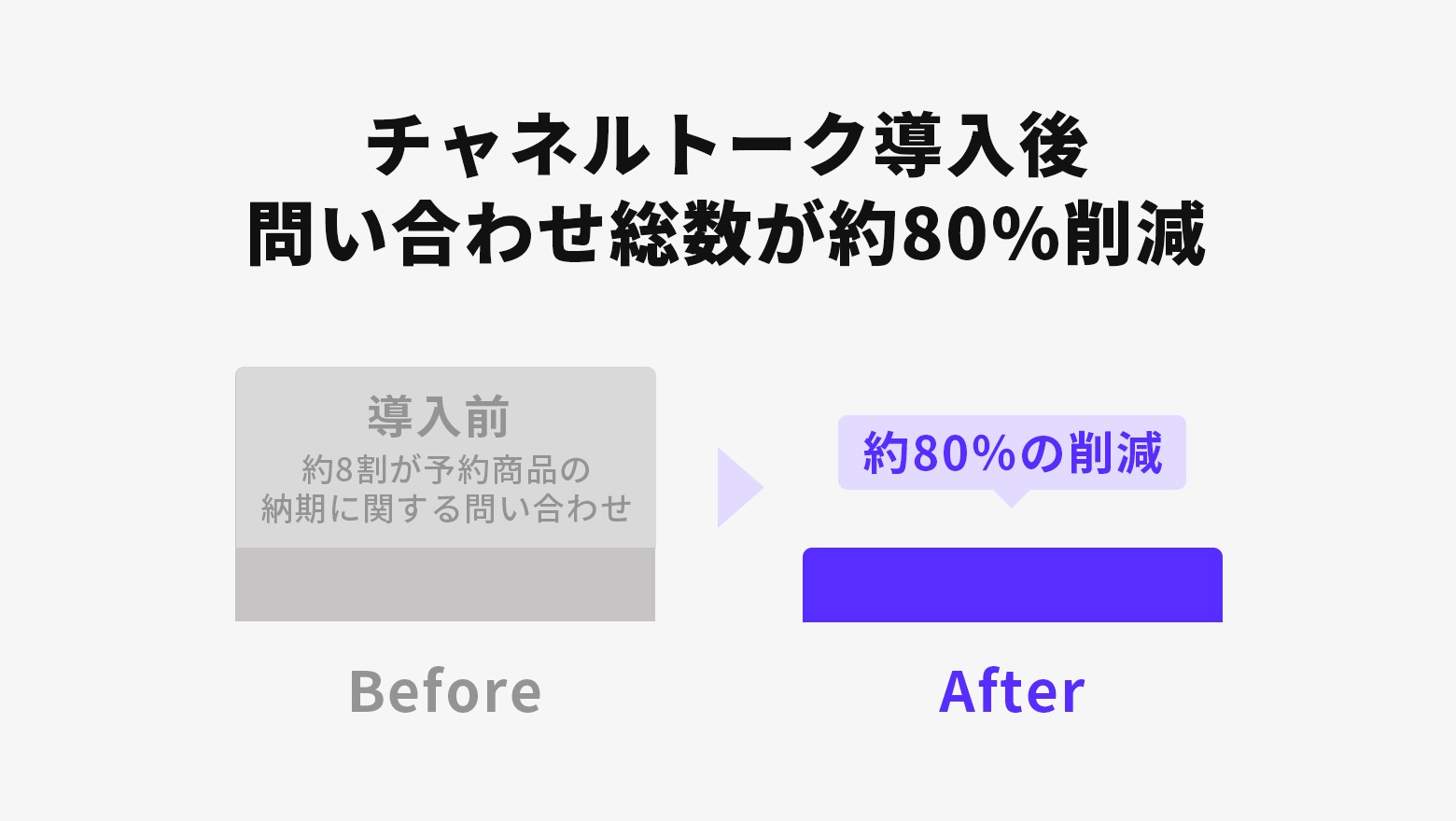 チャネルトーク導入後、チャットボットでよくある質問を自動案内した結果、問い合わせ総数を約80%削減。納期確認に関する問い合わせに使っていた時間でメルマガといったマーケティング施策に注力したり、チャネルトーク以外での施策に時間を使えるようになりました。