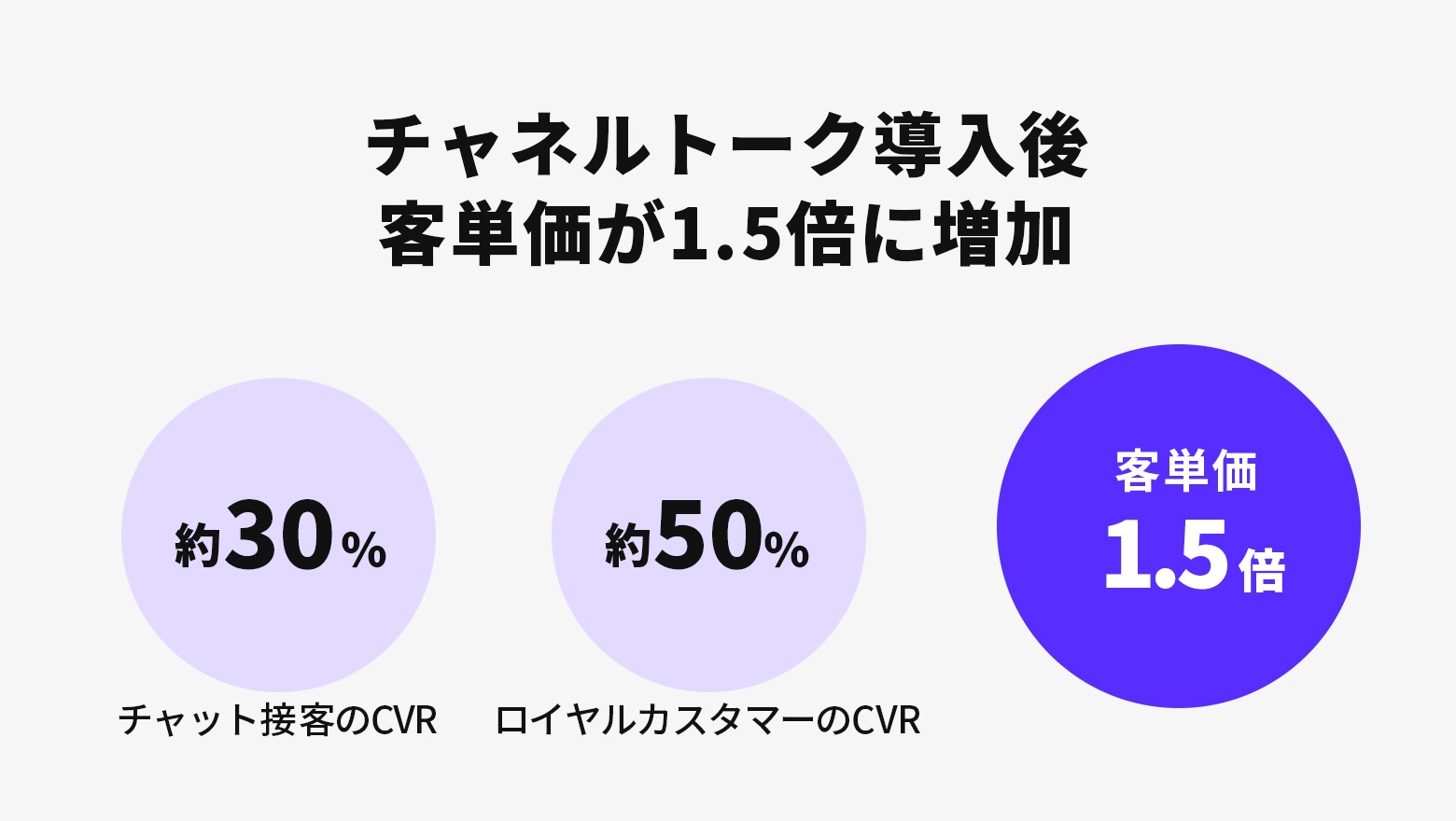 導入後、サポートとマーケティングが同じプラットフォームでつながり、購入前問い合わせが10%から約50%に増加、チャット接客のCVRは約30%、ロイヤルカスタマーの場合は約50%に。チャットなしの場合と比べてチャット接客を介した客単価は1.5倍になりました。
