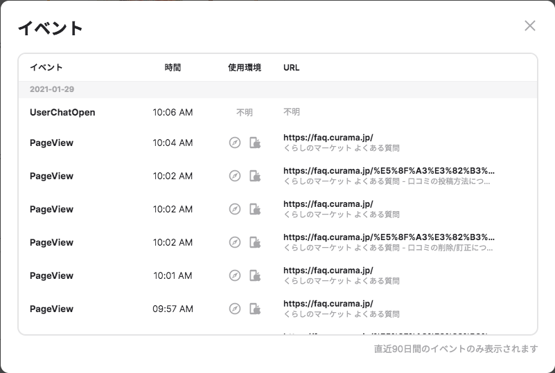 ▲「イベント機能」を、ページ閲覧時間、使用デバイス環境、ページURLなどの情報が見れる。