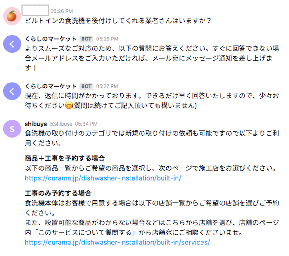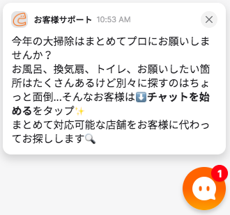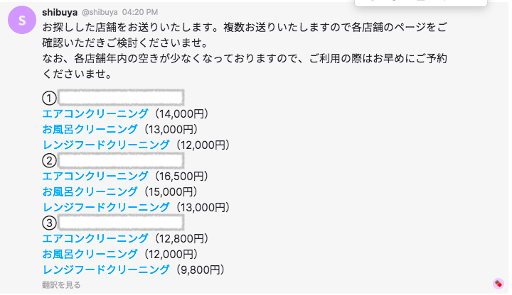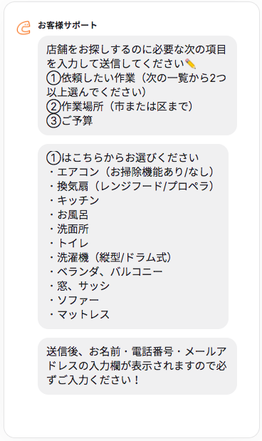 施策としてはチャットを通じて、既存機能では実現できなかった複数カテゴリをまたいだ予約提案を行いました。お客様の中には、「エアコン」と「換気扇」など、まとめて清掃を行ってくれる店舗を探したい場合がありますが、探す前にサイトから離脱されることもあります。そこで自分で探す手間を省きたい方向けに、検索代行を行い、希望の条件が叶う店舗紹介を行っています。お客様にとって痒いところに手が届くような接客サービスを実現できました。1ヶ月間で1人のメンバーが200人以上のお客様のチャット接客を行い予約に繋げることができました。中にはお客様1人で2~3件予約してくださることもありましたね。チャット接客には多大な工数がかかっているわけではありません。問い合わせいただく際に、店舗を探す際に必要な項目(①依頼したい作業 ②作業場所(市区町村まで)③ご予算 )をチャットボットで予め伝えています。そうすることで、担当者につながった後のコミュニケーションの往復回数が減り、CSにとってもお客様にとっても、スムーズなコミュニケーションが可能になりました。