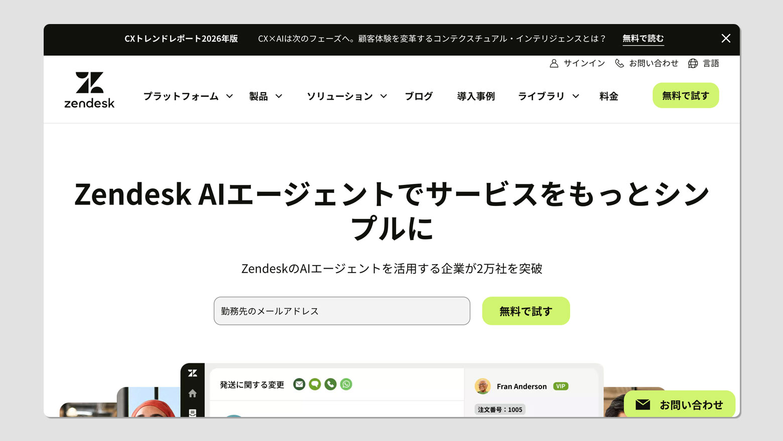 Shopifyの注文データや在庫情報をリアルタイムで参照し、最大60%の問い合わせをAIが解決すると公表されています。