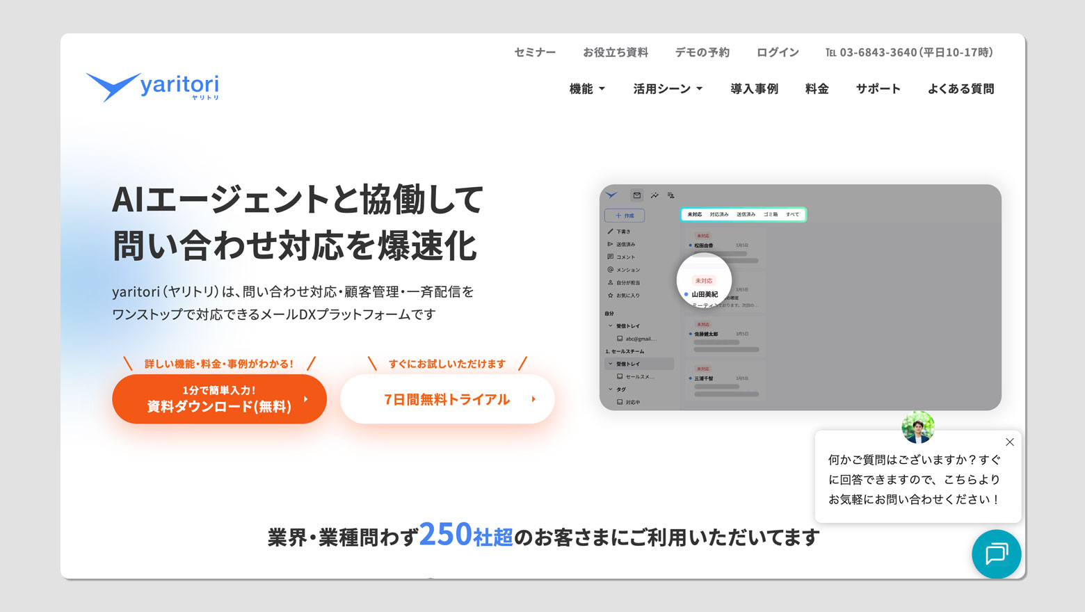 一方、「問い合わせ件数に対して人手が足りない」「夜間・休日も対応したい」「定型的な問い合わせに人員を割きたくない」という課題であれば、チャットベースでAIエージェントが自律的に対応を処理するツールが有力な選択肢です。