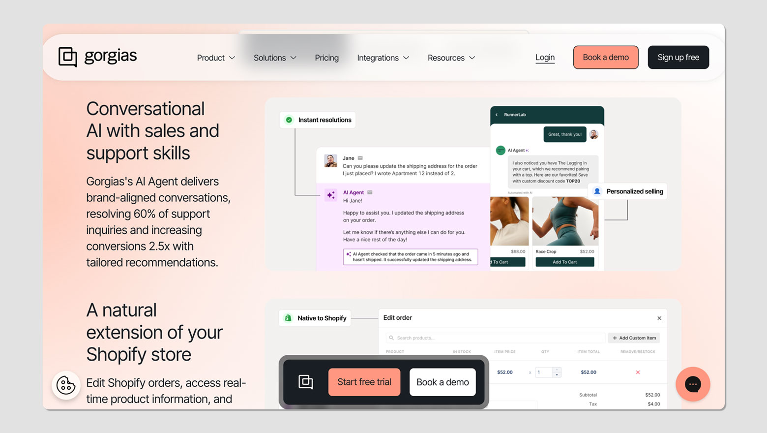 Gorgiasは、EC事業者に特化したカスタマーサポートプラットフォームです。AIエージェントが購入前の接客と購入後のサポートの両方を自動化する設計が特徴的です。