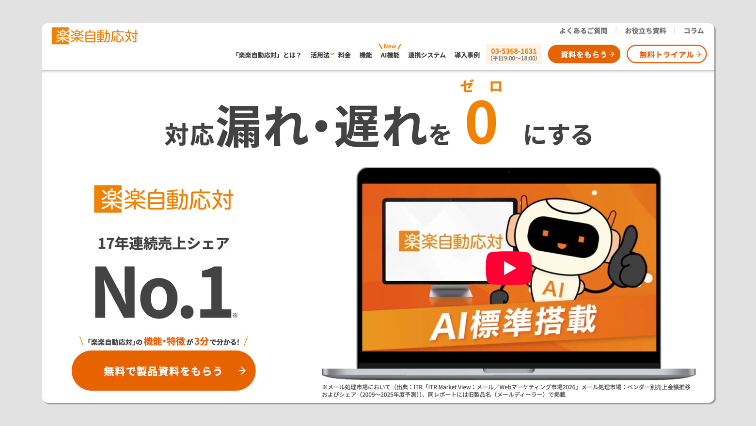 料金体系: 成果報酬型(AIが解決した件数に応じた課金)。価格は非公開で、デモ・個別見積もりが必要。