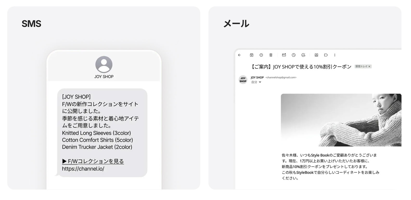 データを活用し、特定のページを何度も閲覧している顧客や、過去に購入経験があるリピーターに対して、個別SMSとメール経由でメッセージを自動配信することも可能です。