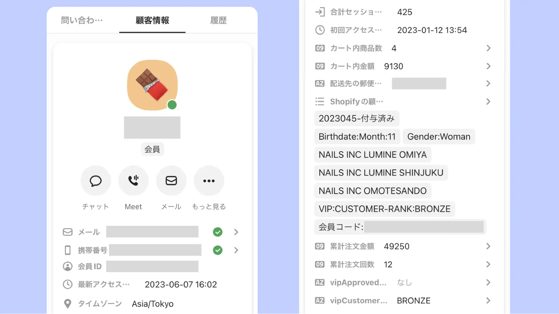 ▲チャネルトーク上での顧客プロフィール情報(実店舗の購買情報とECでの購買情報が連携されているため、スムーズ・売上に繋がる接客が可能)