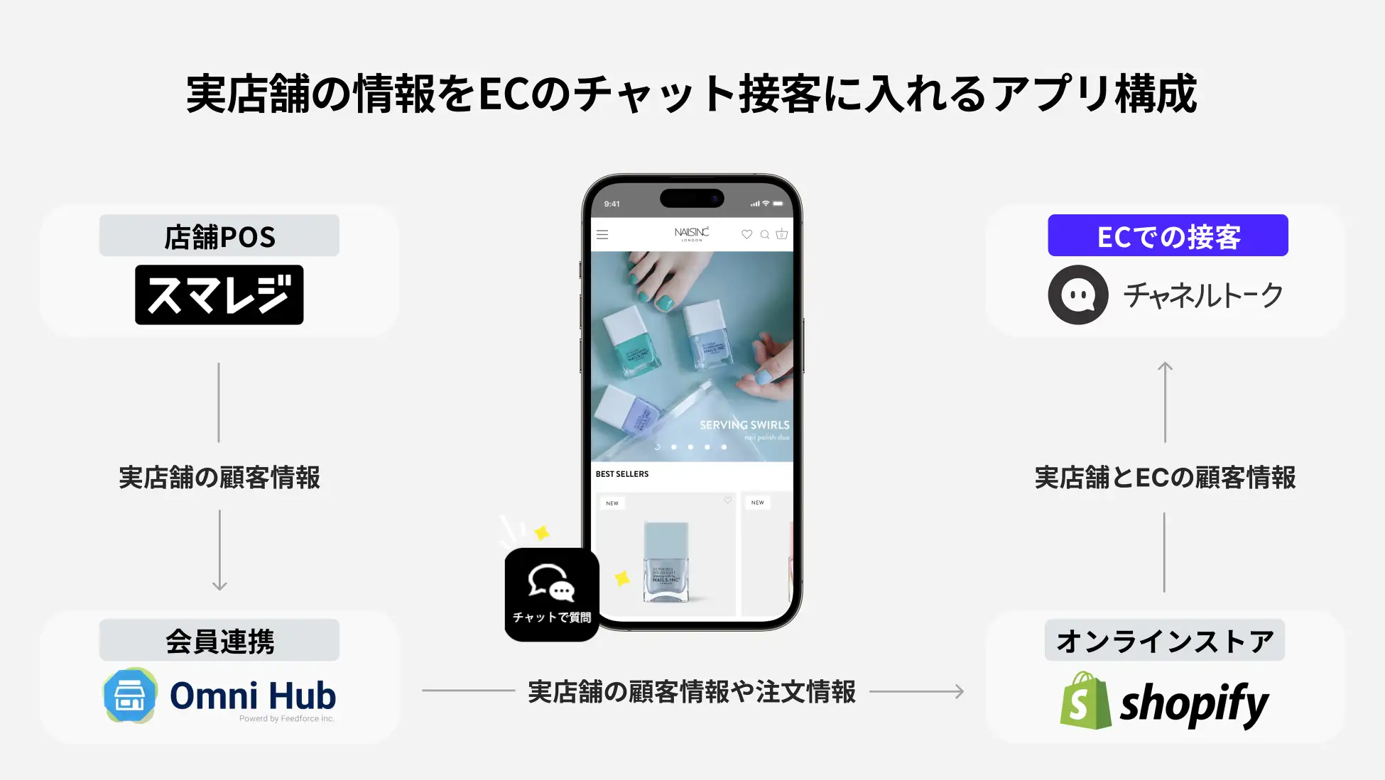 NAILS INCでは、「スマレジ」を利用して実店舗での販売管理を行っています。店舗での顧客の購買情報は、オムニチャネル会員連携アプリ「Omni Hub」を通じてShopifyに連携されます。これによって、顧客情報をShopifyやチャネルトークでも確認しながら接客を行っています。