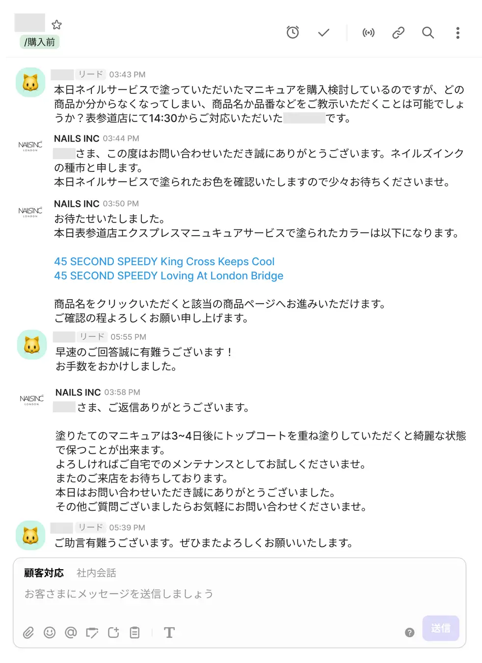 我々の商品はカラーバリエーションが100色以上と豊富にあるので、ご購入前に色味の違いをご質問くださる方も多いのですが、顧客様の場合はご購入履歴を辿ってお持ちのお色を確認しながら嗜好に合った商品をご提案したりと、チャット上でも実店舗同様の接客が出来ています。