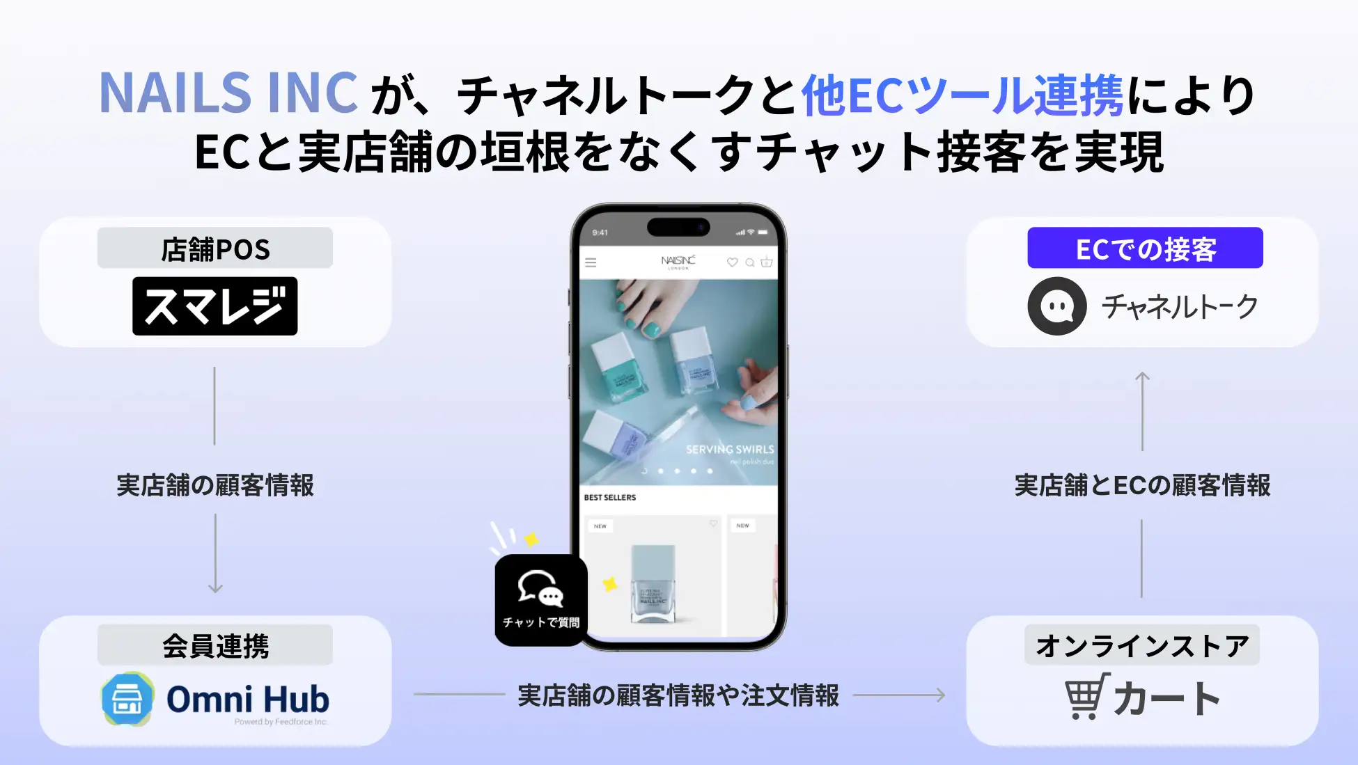 All-in-one接客チャットの「チャネルトーク」 株式会社Channel Corporation、所在地:東京都中央区、CEO:玉川葉、以下「チャネルトーク」)は、株式会社TATが運営する「NAILS INC」公式サイトにチャネルトークが導入されていることをお知らせいたします。NAILS INCでは運営する実店舗での顧客情報を「スマレジ」で管理し、それらを「Omni Hub」を通してオンラインストアと連携させ、それらの情報を活用しながらチャネルトークを通したチャット接客での売上向上にも取り組んでいます。
