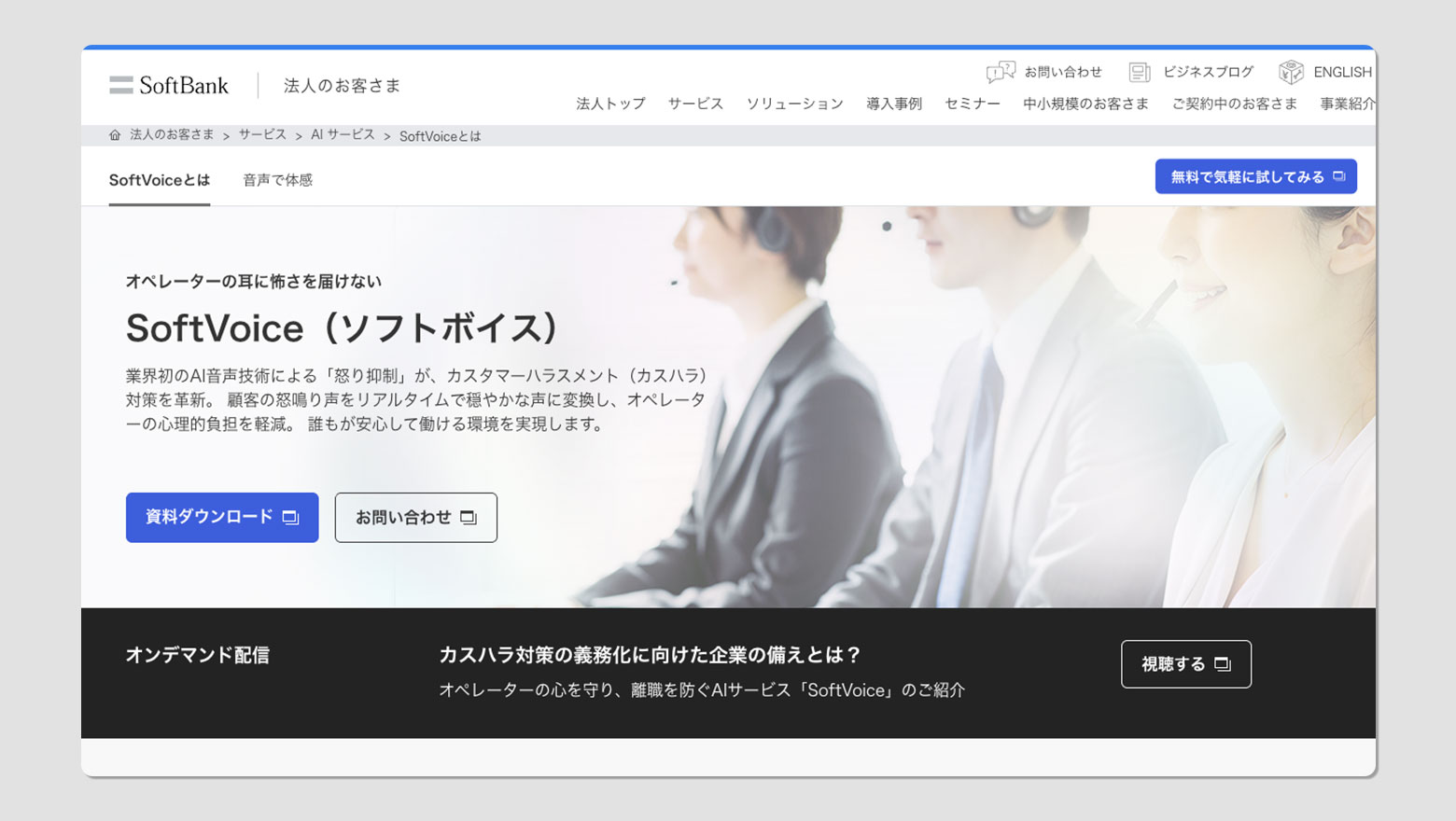 お客様の怒鳴り声や攻撃的なトーンをAIがリアルタイムで検知し、オペレーターの耳に届く前に穏やかな声へと変換する最新技術です。声そのものを加工するという、これまでにないアプローチで現場スタッフを守ります。