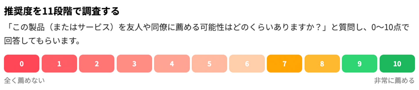 まずは顧客に対して「この製品(またはサービス)を友人や同僚に薦める可能性はどのくらいありますか?」という質問を投げます。