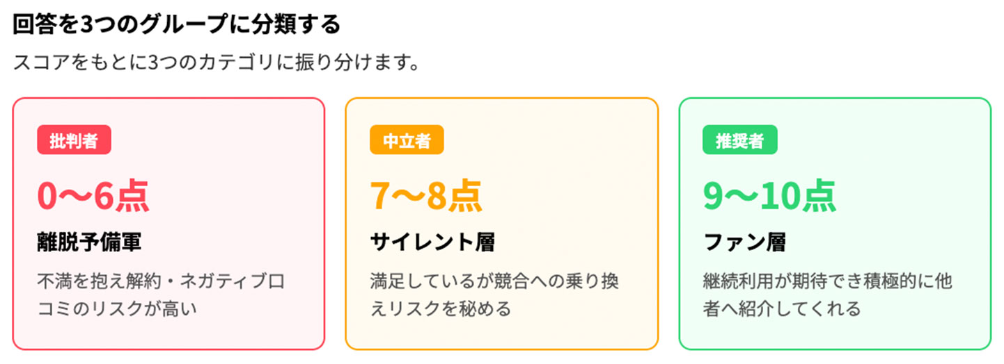 推奨者(9〜10点):継続利用が期待でき、他者へ積極的に紹介してくれる「ファン層」