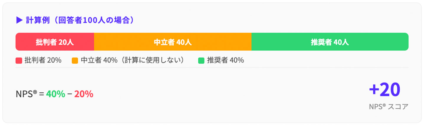 例えば、100人の回答者のうち推奨者が40人(40%)、中立者が40人、批判者が20人(20%)だった場合、NPS®は「40-20=20」となります。