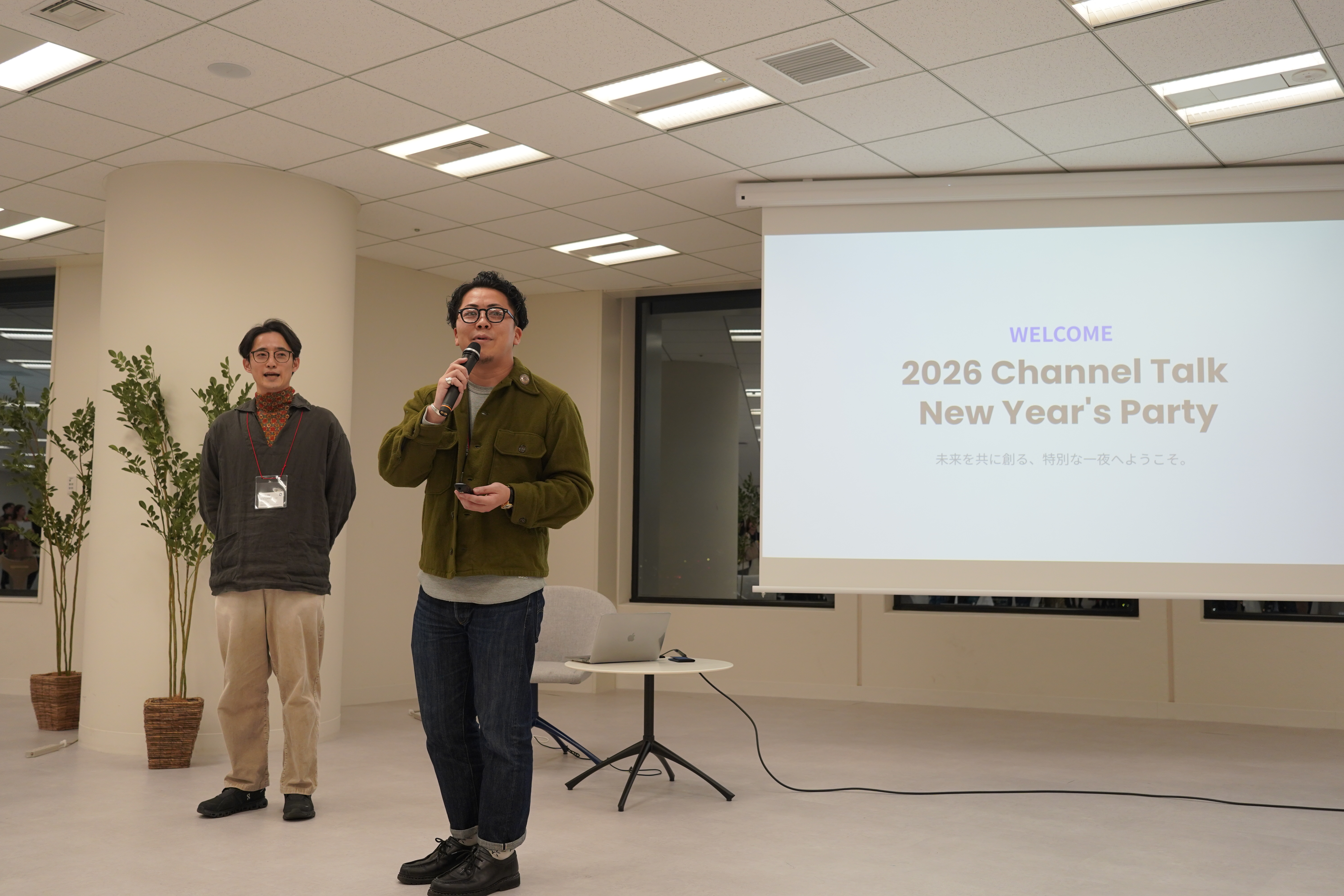 新年会は、代表・Jayの挨拶からスタート。 「チャネルトーク」がカスタマードリブンをコンセプトに、AIを活用したカスタマーサクセス機能を提供してきたことを改めて強調しながらも、イーロン・マスク氏の「AIが人の仕事をなくす」という発言に触れ、「どれだけAIが発達しても、人にしかできない仕事は必ず残る」と断言しました。