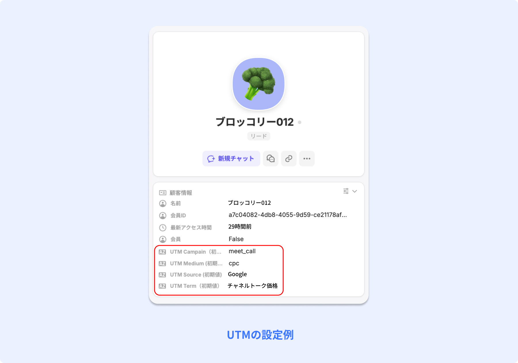 チャネルトークの顧客プロフィールでもUTMパラメータを確認できます。