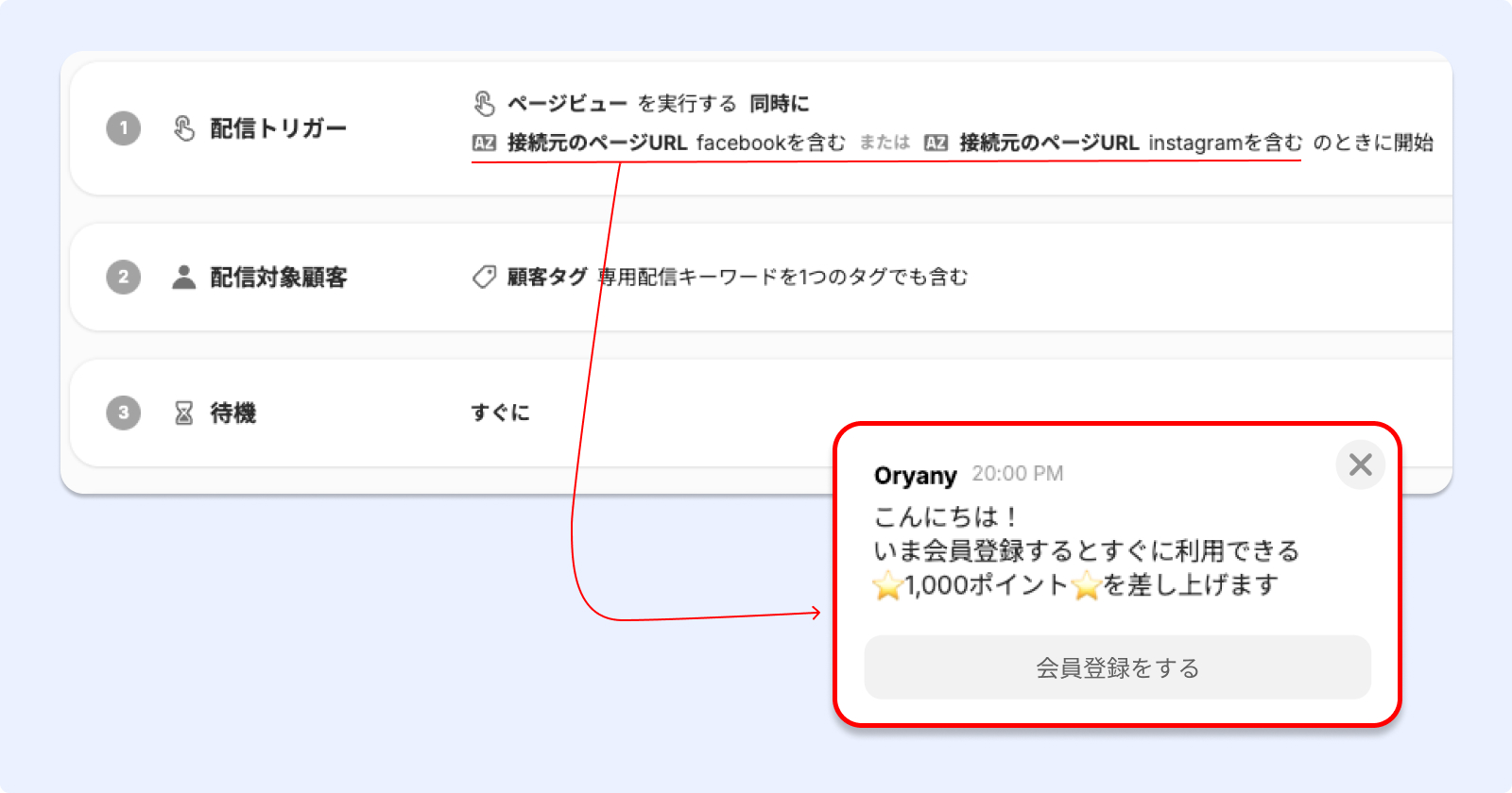 Oryany(オヤニー)は、自社ECサイトにアクセスした顧客のうち、SNS広告を通じてアクセスした顧客がそのまま離脱せずに会員登録するようにしたいと考えていました。そこで、断れないような会員登録特典をチャネルトークのメッセージで届けました。広告のランディングページとして設定された自社ECサイトのURLに、広告ソースとして設定されたUTMが含まれている場合にのみメッセージがポップアップされるよう設定したのです。