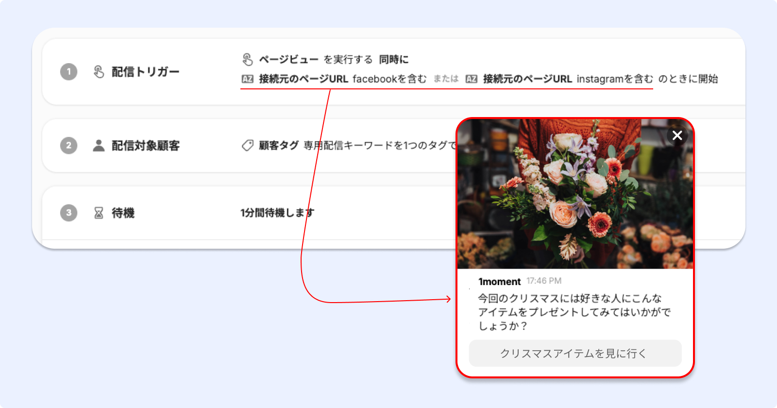 1moment(ワンモーメント)も同様の方法でUTMを活用しました。クリスマスに合わせてSNSで企画展の広告を実施していた1momentは、広告を見て訪れた顧客に広告とつながる体験を提供したいと考えました。SNS経由でアクセスした顧客を対象に、素敵な画像とともにクリスマスアイテムを閲覧できるリンクを含むメッセージを配信しました。広告から流入した顧客がサイトでどの商品を見ればよいか分からない方が多いというインサイトを、メッセージに見事に反映した事例でした。