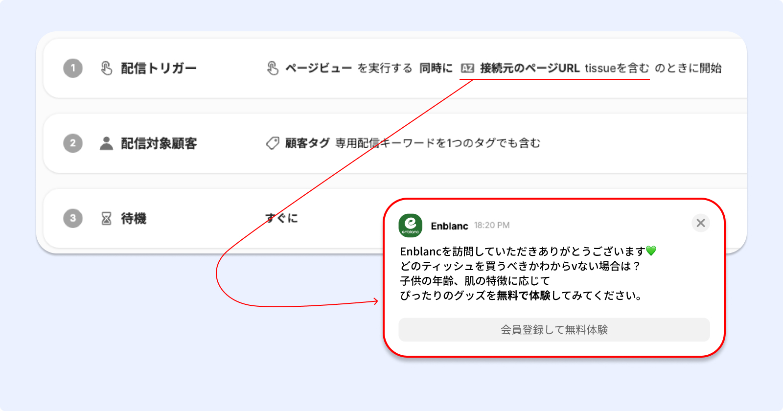ベビー用品専門ブランドのEnblanc(アンブラン)は、キーワード広告経由の流入が多い状況でした。流入した顧客を会員登録させることが第一の目標でした。そこで、検索広告で流入した顧客に無料体験イベントがあることを訴求しました。たとえばウェットティッシュを検索して流入した顧客には、ウェットティッシュの無料体験に関する案内メッセージを送るように設定しました。
