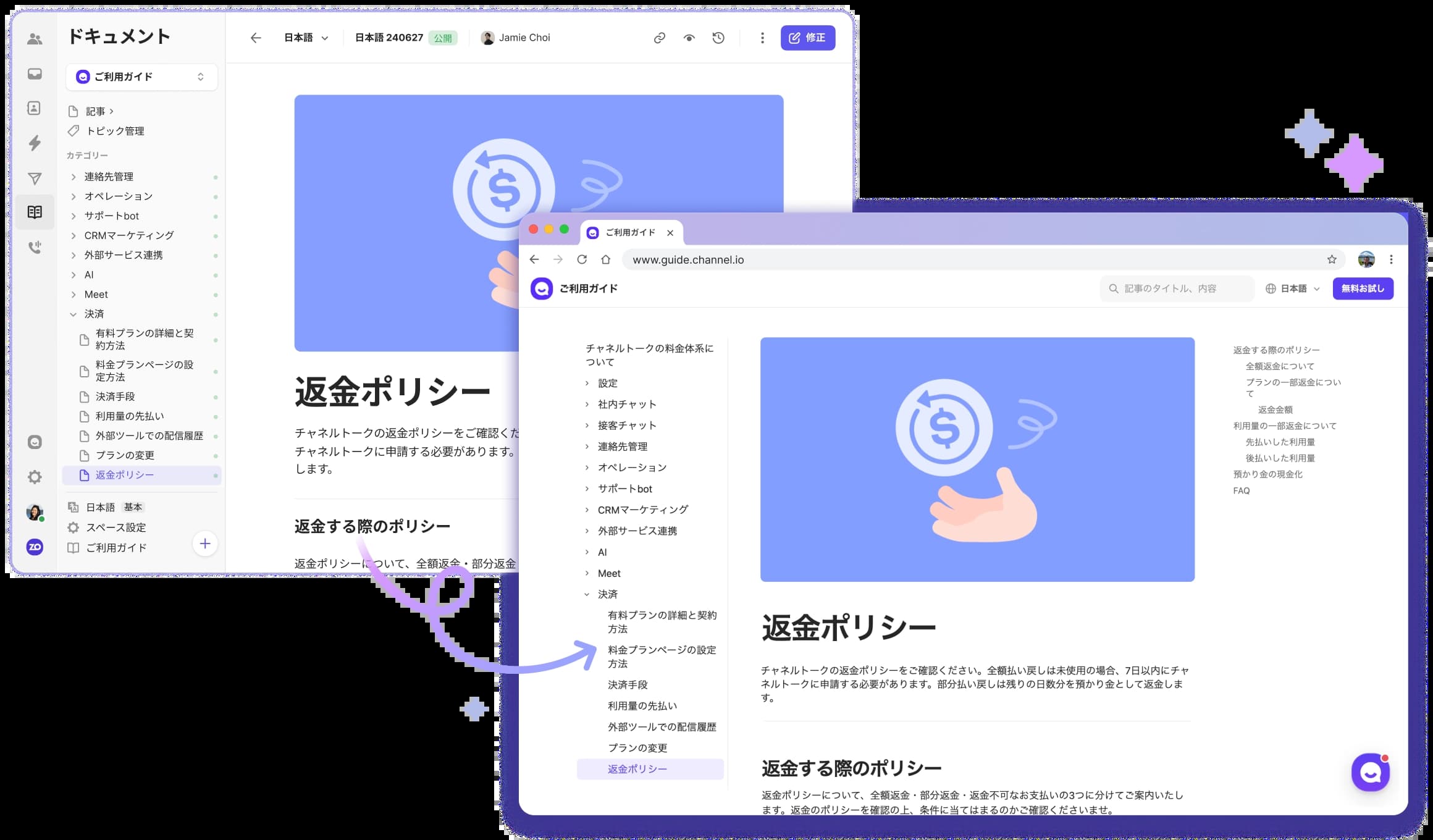 バージョン履歴、カテゴリ、トピックでドキュメントを体系的に管理できます。