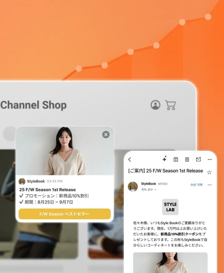 店舗での接客のように、顧客に必要な瞬間に顧客に合ったメッセージを送信できます。案内文や画像をカスタマイズしてブランドの雰囲気を表現できます。