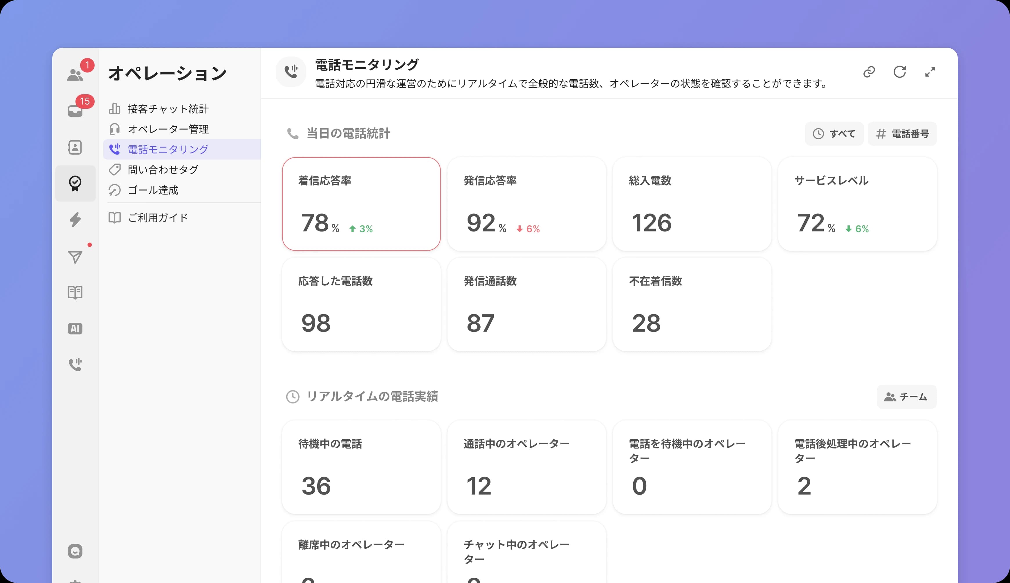 今日の電話応答率、待ち呼数などの電話対応の状況が1分ごとに更新されます。