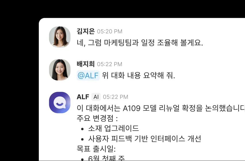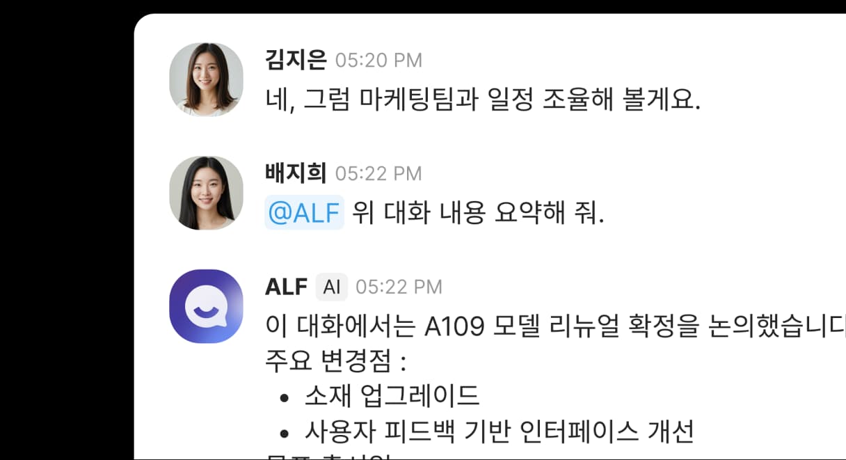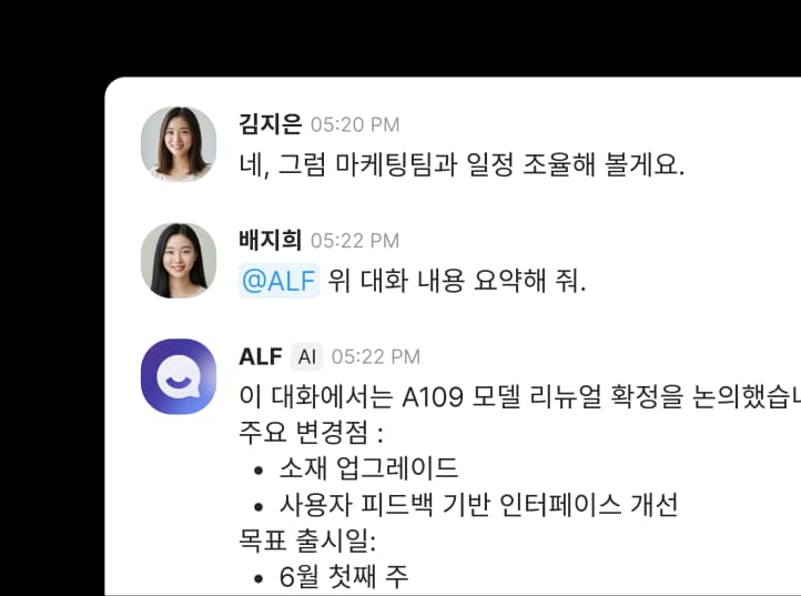 맞춤법, 오타 검수나 용어 뜻 찾기, 간단한 엑셀 수식 등 도움이 필요할 때 빠르게 팀 ALF에게 물어보세요.