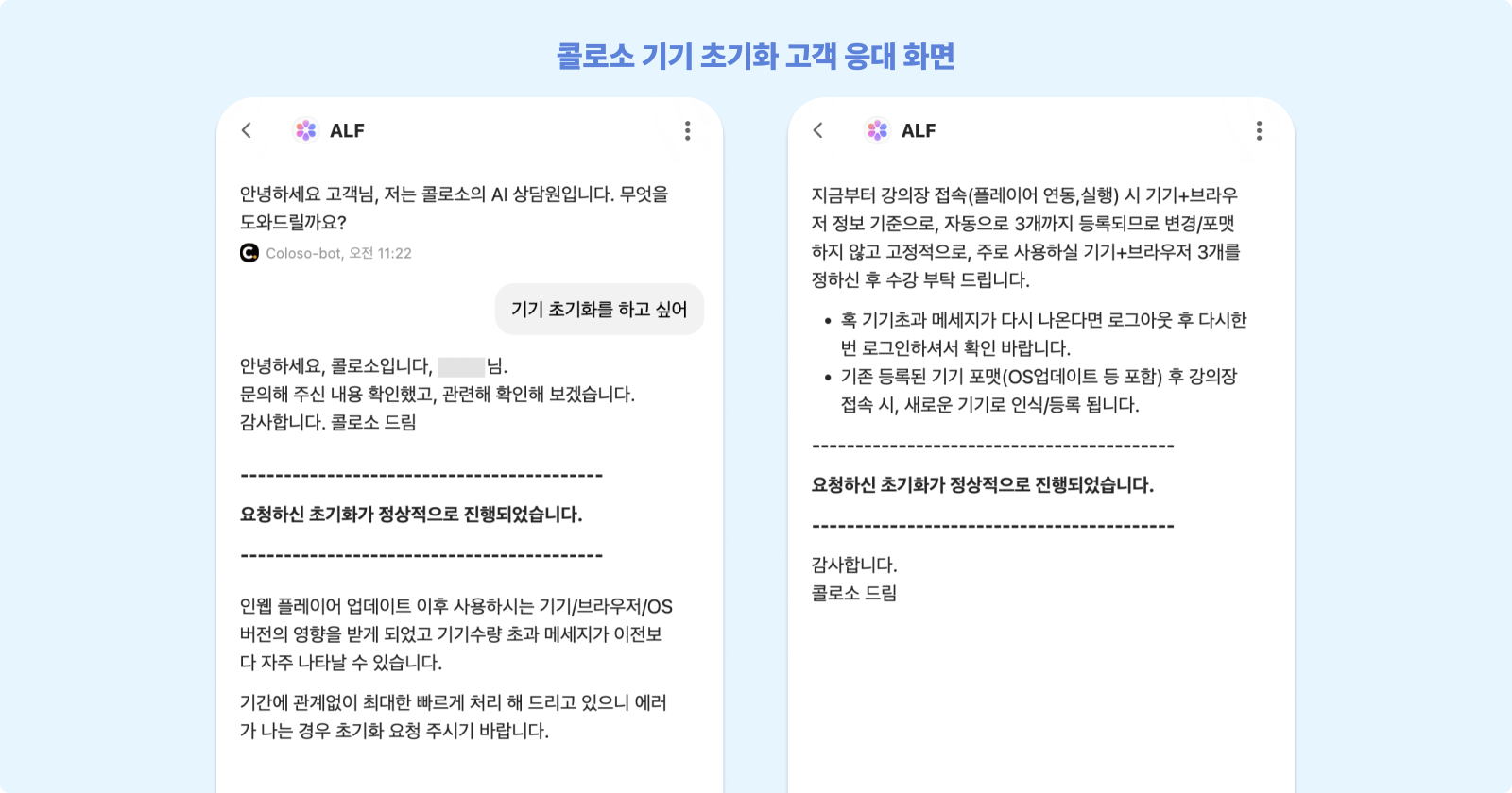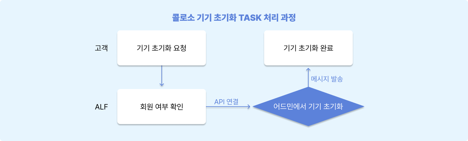 고객이 요청하면 ALF가 회원 여부를 파악해 내부 시스템에서 바로 상담원 개입 없이 기기 초기화를 완료합니다. 콜로소 어드민과 ALF를 API로 연결했기에 가능한 일인데요! 고객이 기기 초기화를 요청하면 ALF가 회원 여부를 파악하고, 어드민에서 직접 기기 초기화를 진행합니다. 처리까지 끝낸 후 고객에게 완료 메시지를 보내면 상담이 종료되죠.