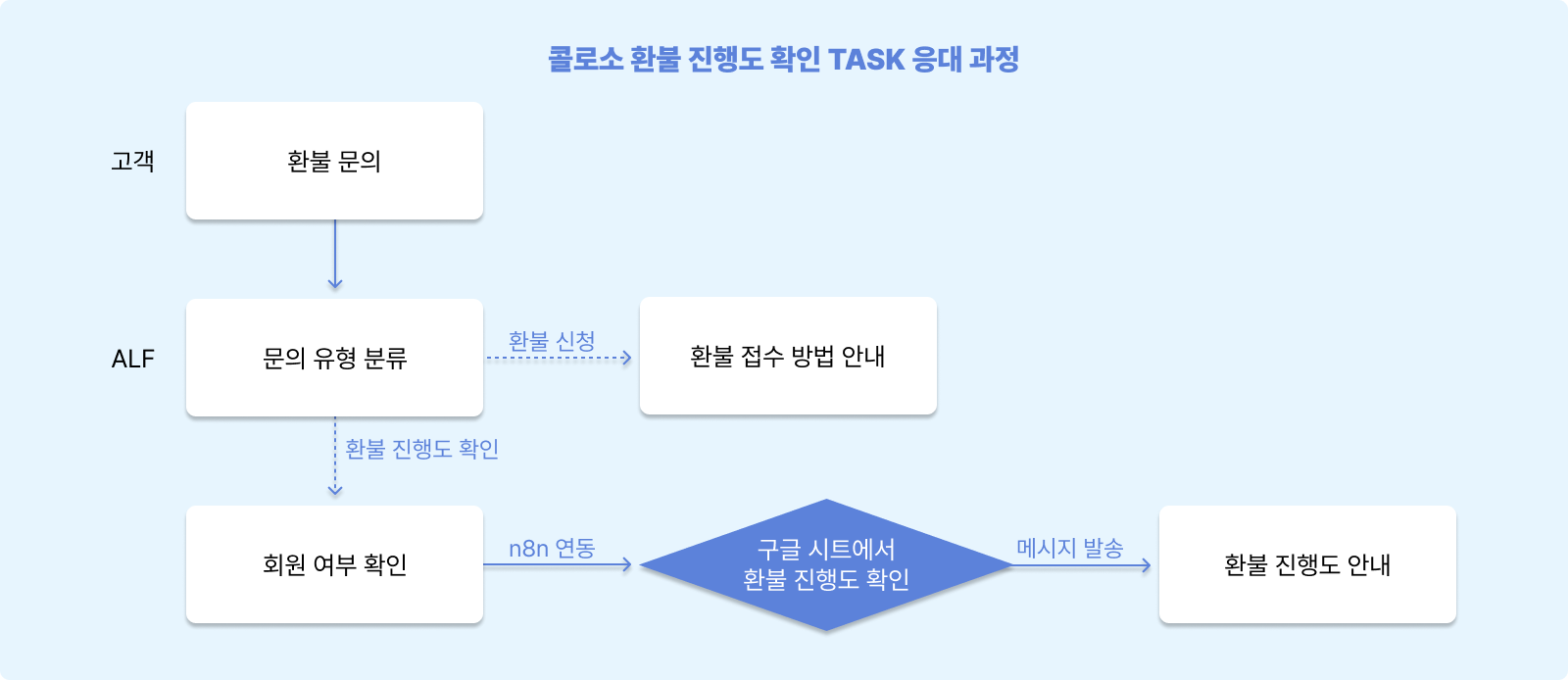 콜로소는 환불 신청 정보를 구글 스프레드시트로 관리하고 있었는데요, 그 시트를 ALF가 확인할 수 있도록 업무 자동화 툴인 n8n을 통해 연동했습니다. 고객이 환불 상태 확인 요청 시 ALF가 회원 정보와 구글 스프레드시트를 대조・확인 후 안내하도록 만들었죠. 또한 아직 환불을 신청하지 않은 고객이라면 환불 접수 방법을 안내하도록 설계했습니다.