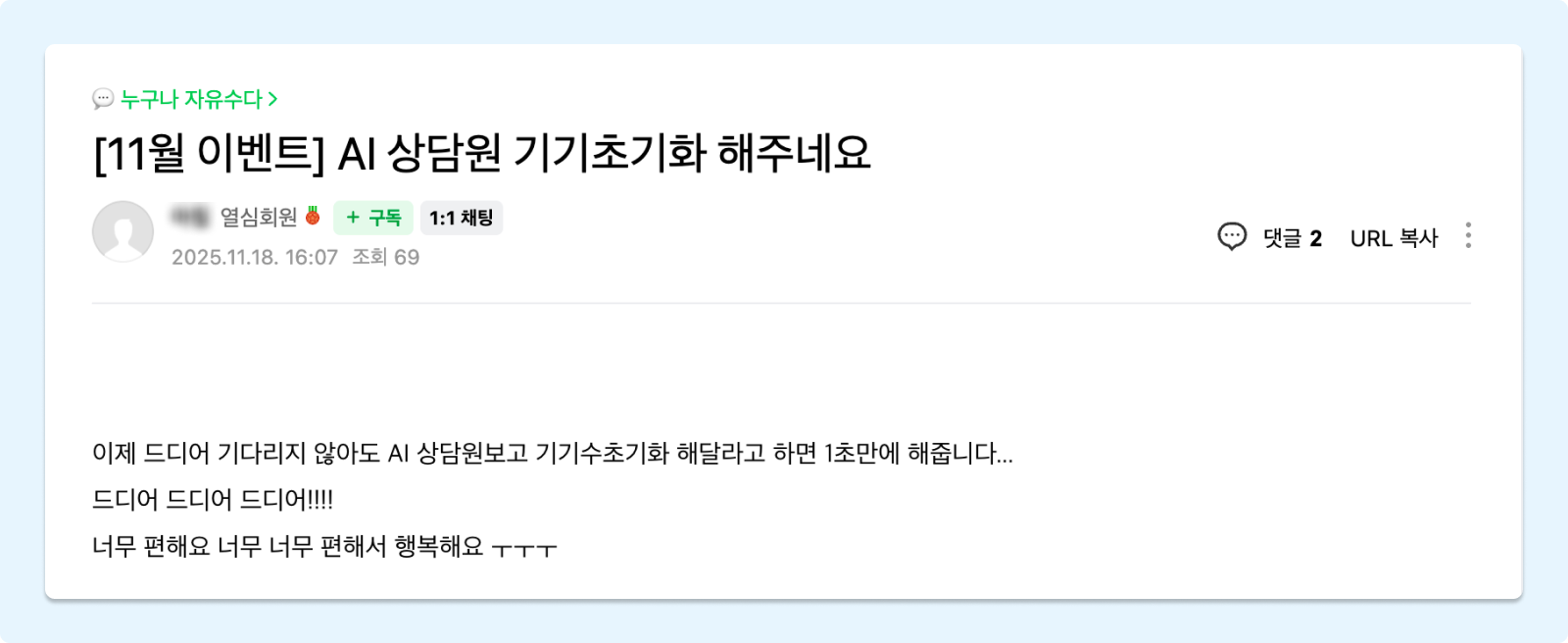 기기 초기화, 환불 상태 확인 등 단순 반복 문의 83% 감소