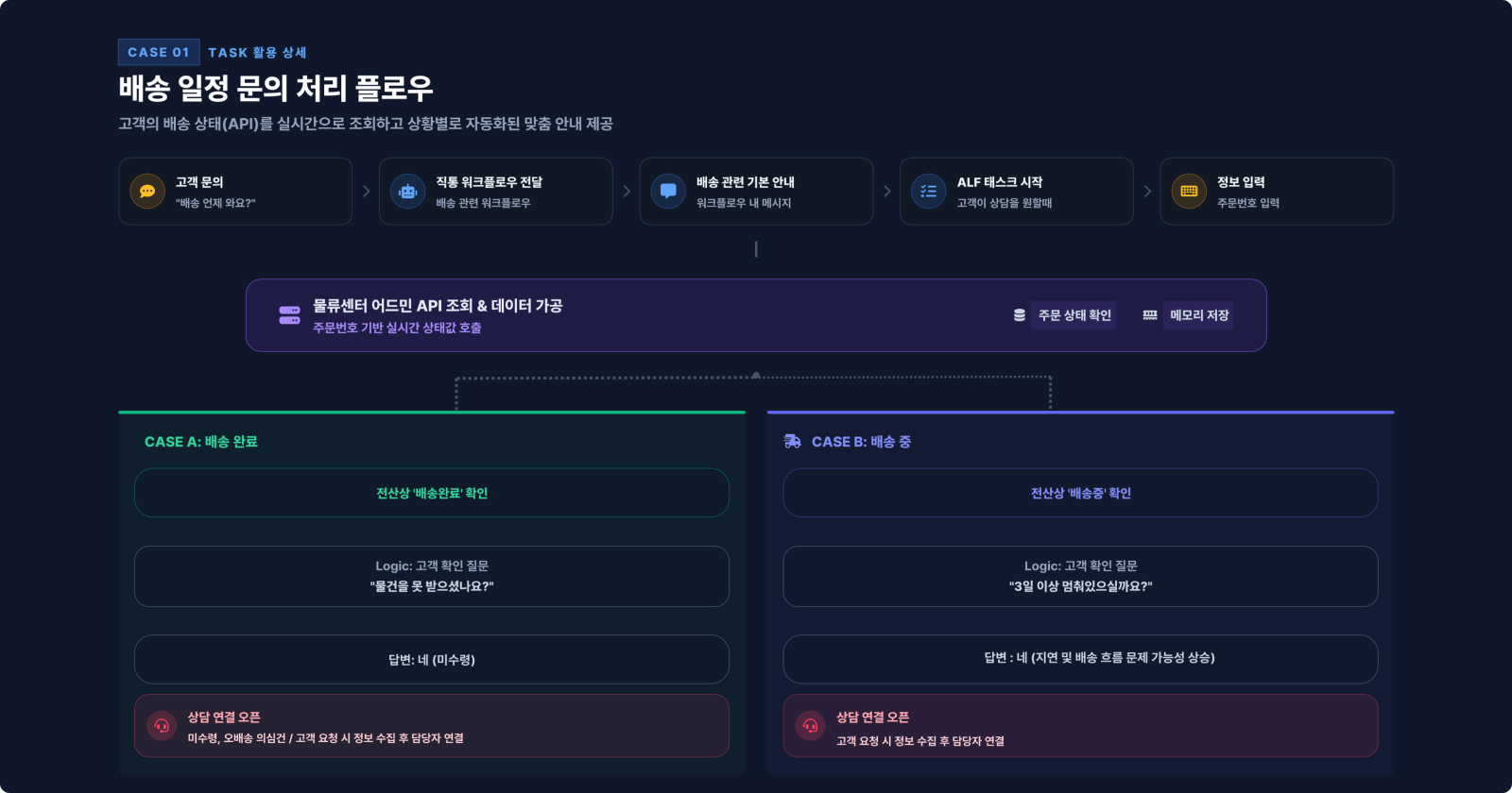 고객이 "배송 언제 와요?"라고 문의하면, 배송 전용 워크플로우가 먼저 출고 일정을 안내합니다. 담당자 연결을 원할 경우에만 주문 번호를 입력받고, API 태스크를 실행해 송장 번호와 배송 흐름을 자동 조회합니다. 배송 중이면 상태를 안내하고, 배송 완료 후 수령 문제가 있다면 정보를 수집해 상담사에게 연결합니다. 상담사는 원인 파악과 후처리에만 집중하면 됩니다.