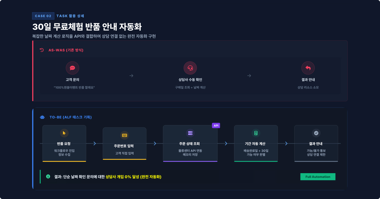 슬룸의 '30일 무료 체험' 프로그램은 30일 동안 체험한 뒤 제품이 마음에 들지 않으면 반품 가능한 서비스입니다. 반드시 배송 완료 후 30~40일 사이에만 반품을 신청할 수 있는데요. 이전에는 상담사가 주문을 수동으로 조회하고 날짜를 일일이 계산해 안내해야 했습니다. 지금은 고객이 주문 번호를 입력하면 API 태스크가 배송 완료일 기준으로 반품 가능 여부를 자동 판별하고, 가능한 경우에만 상담을 연결합니다. 무료 체험 반품 신청 과정에서 사람이 일절 개입하지 않습니다.