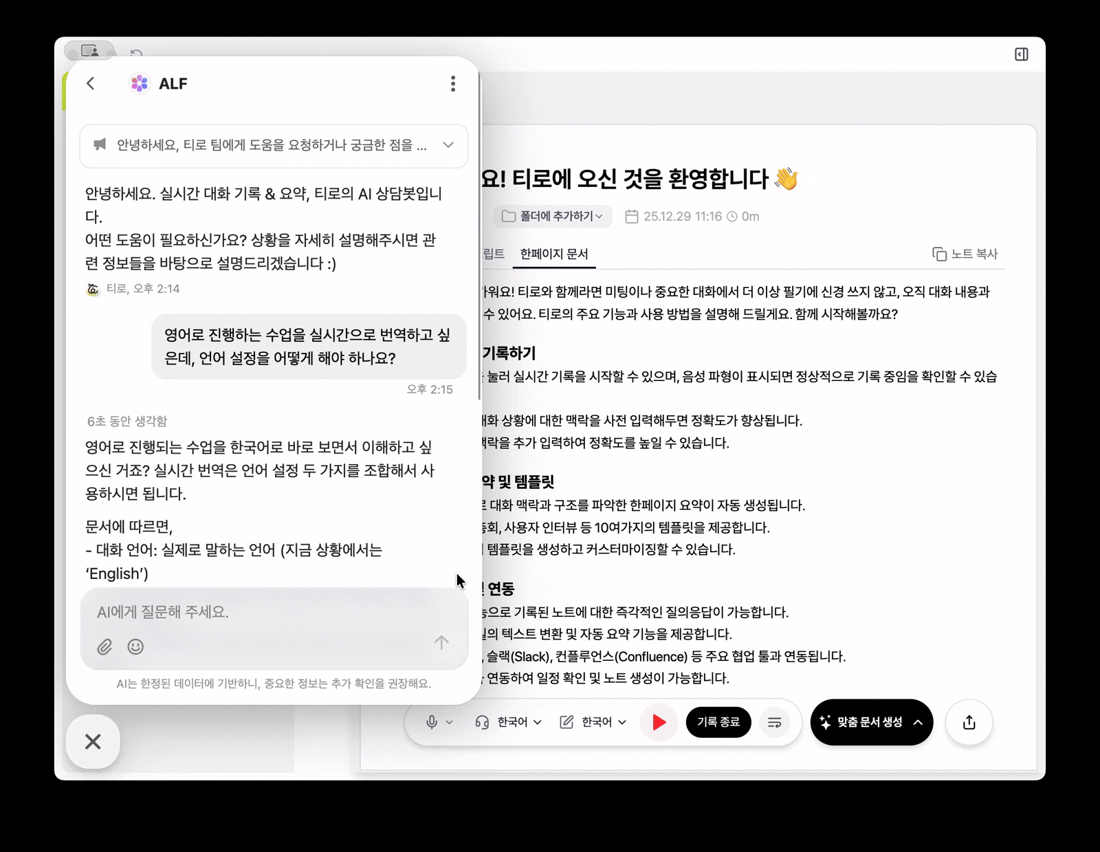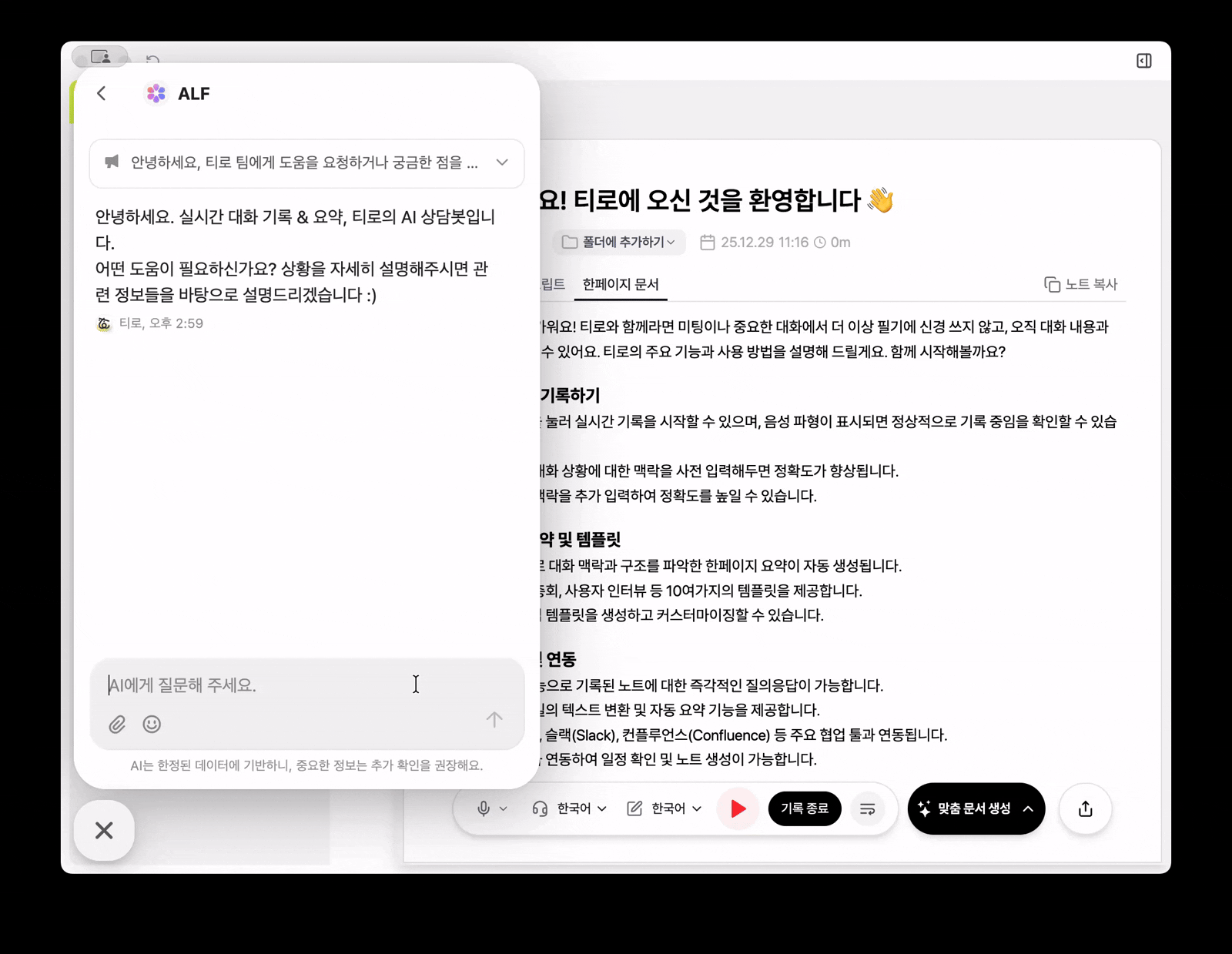 사용자가 자주 묻는 질문이나 단순 사용 방법, 플랜 정보 문의는 ALF가 ‘지식’을 참조해, 티로에 딱 맞는 답변을 제공합니다.