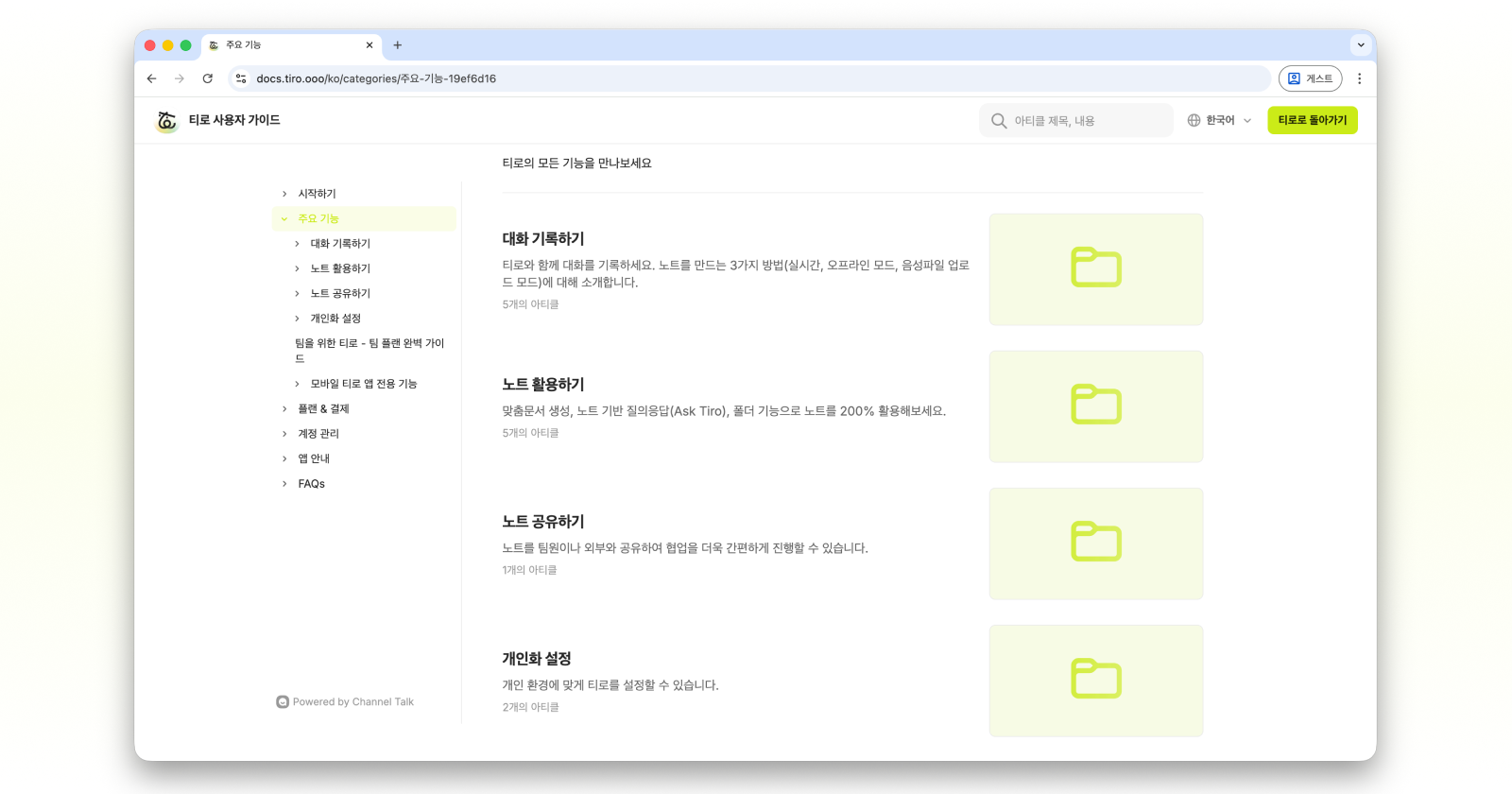 티로팀은 ALF를 본격적으로 사용하기 전부터 채널톡의 도큐먼트를 활용해 사용자 가이드를 운영해 왔습니다. 게다가 도큐먼트를 △시작하기 △주요 기능 △계정 관리 △FAQs 등으로 구조화해 둔 덕분에, 그대로 ALF 지식으로 적용해도 문제가 없었죠. 잘 정리된 도큐먼트를 활용해 큰 어려움 없이 ALF가 빠르고 정확한 답변을 생성하도록 지식을 세팅할 수 있었습니다.