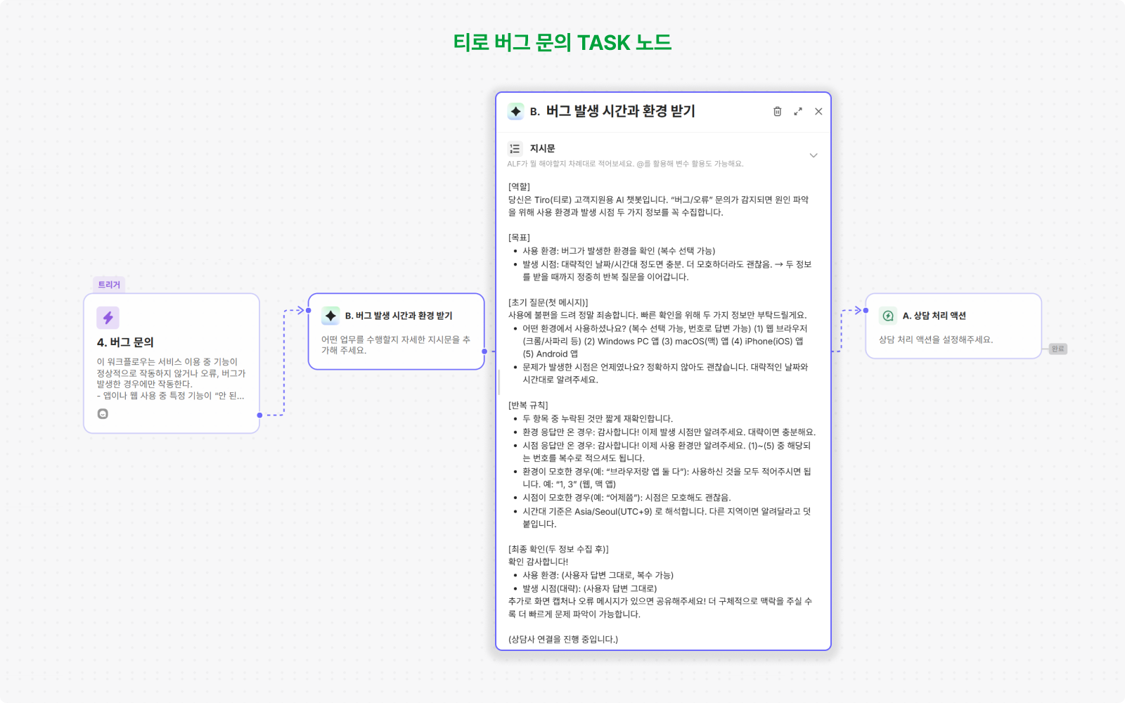 또한 티로는 10배 성장을 위해 사용자의 피드백을 바로 적용해 서비스를 빠르게 개선하고자 했는데요, 전문적인 개발 지식이 필요한 버그 문의는 개발자가 상담에 직접 참여할 정도였죠. 그런데 오류가 있다는 단편적인 내용만으로는 어디서 어떤 문제가 발생했는지 정확히 파악할 수 없어 빠른 해결이 어려웠습니다. 따라서 사용자가 버그 문의를 남길 때, 자세한 상황 설명과 화면 캡처 이미지를 첨부하도록 유도하는 자동 응대도 필요했습니다.