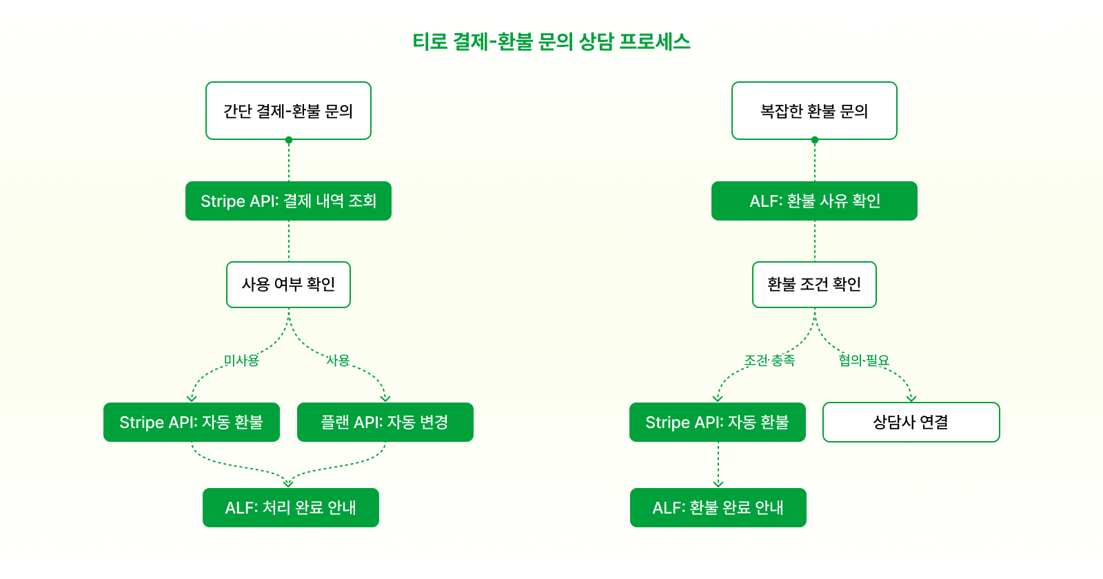 태스크를 적용하기 전에는 환불 문의가 들어오면 무조건 박지윤 매니저님이 일일이 확인하고 처리해야 했습니다. 이제는 환불 문의 시, ALF가 사용자의 플랜 정보나 결제 시기, 결제 방법 등을 체크하고 사용자에게 해당 정보가 맞는지 확인합니다. 이어서 한 번 더 사용자의 환불 의사를 확인한 후, 해당 사용자가 티로의 환불 정책에 해당한다면 환불까지 처리해 주죠. ALF가 최종 처리까지 완료해 주니 지윤 매니저님은 전체 문의를 분석하고 프로덕트를 개선하는 업무에 더 많은 시간을 투자할 수 있게 됐습니다.