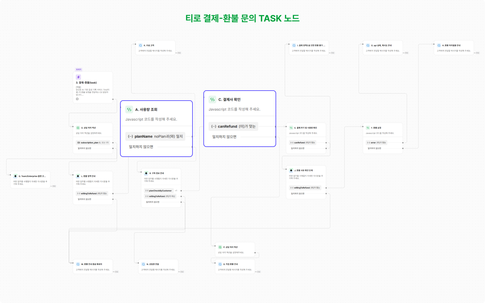 마지막으로, 티로팀은 정해진 프로세스에 따라 처리하는 결제 및 환불 문의도 AI로 자동화할 수 있다고 판단했습니다. 이에 ‘태스크’ 기능을 활용해 ALF가 사용자의 결제 정보를 확인하고 구독 플랜을 적용해 주거나 환불해 주도록 세팅했습니다.