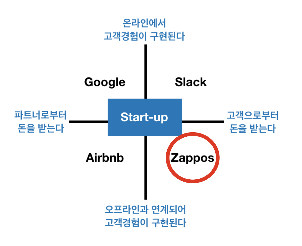 * Zappos 유형: 고객이 돈을 내고 + 오프라인에서 고객경험이 구현(실물 제품)되는 형태. 이 유형은 주로 Zappos처럼 고객감동을 불러오는 커뮤니케이션으로 세일즈를 증대하는 오퍼레이션 목표를 설정함