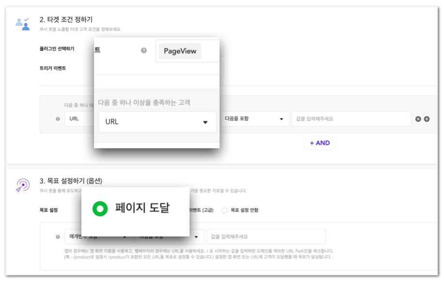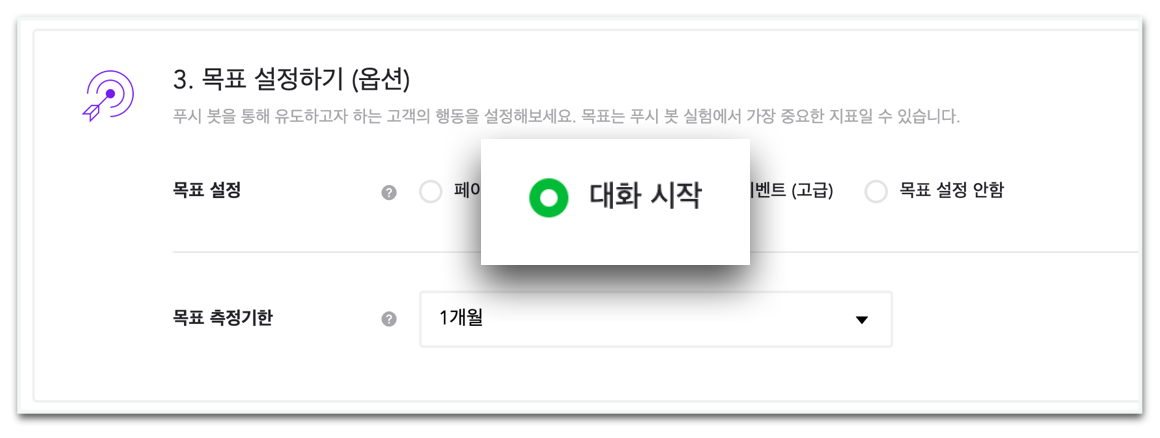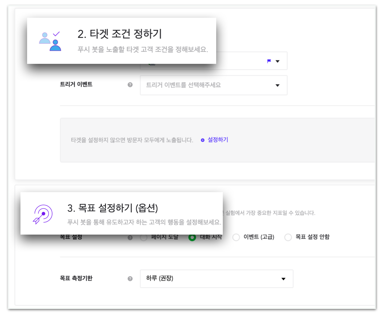 2. 타겟 조건은 푸시봇을 어떤 사람들에게 보여줄지를 설정하는 영역입니다. 3. 목표 설정하기(옵션)는 푸시봇을 통해 유도하고 싶은 최종적인 목적을 정하는 단계구요.