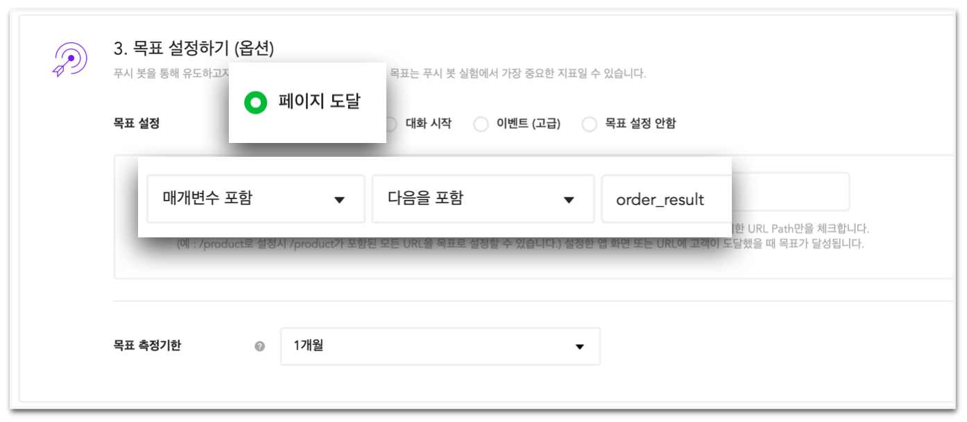 구매전환율 혹은 회원가입률을 높이기 위해 푸시봇을 세팅했다면 '페이지 도달' 옵션을 선택해주세요. 구매를 완료했을 때 뜨는 페이지 혹은 회원가입이 되었을 때 도달되는 페이지의 URL을 입력해주시면 됩니다.