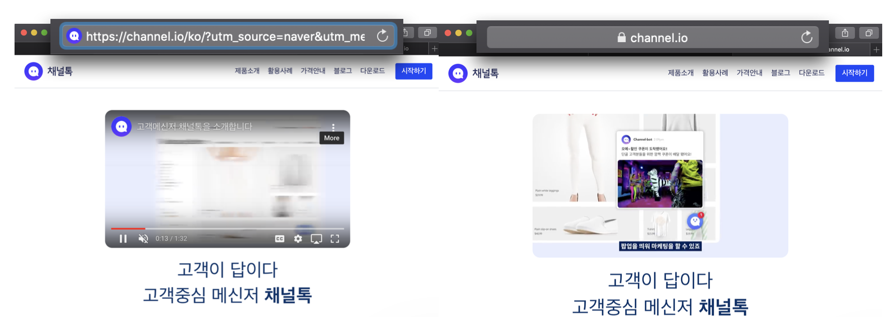 URL은 고정된 형태만 갖지는 않습니다. 구글, 네이버, 페이스북, 인스타그램 등등 다양한 경로를 통해 들어온 고객은 각자의 경로에 따라 다른 주소값을 가지고 유입이 될 수 있죠. 위 이미지처럼 같은 페이지라도 본래의 URL 뒤에 경로에 관한 정보가 붙는 경우도 있답니다.