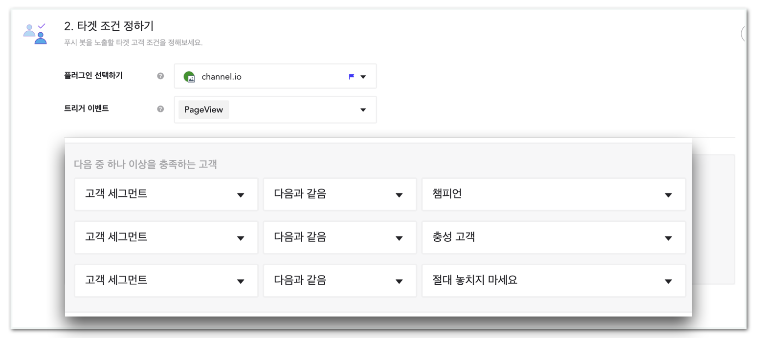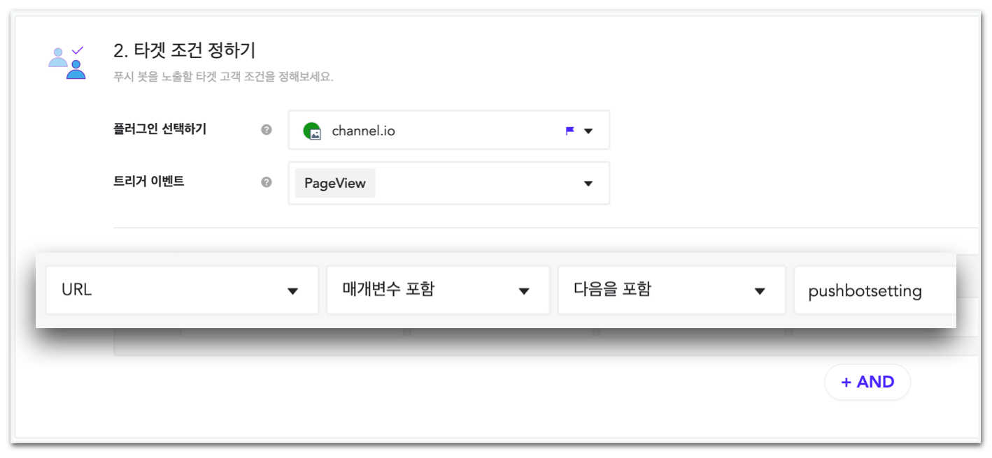AND와 OR은 말 그대로 '그리고'와 '또는'입니다. 여러조건을 동시에 충족해야만 푸시봇 메시지를 노출하고 싶다면 AND로, 여러조건 중 하나만 해당 되어도 푸시봇을 노출하고 싶다면 OR로 조건들을 걸어주는 거예요.
