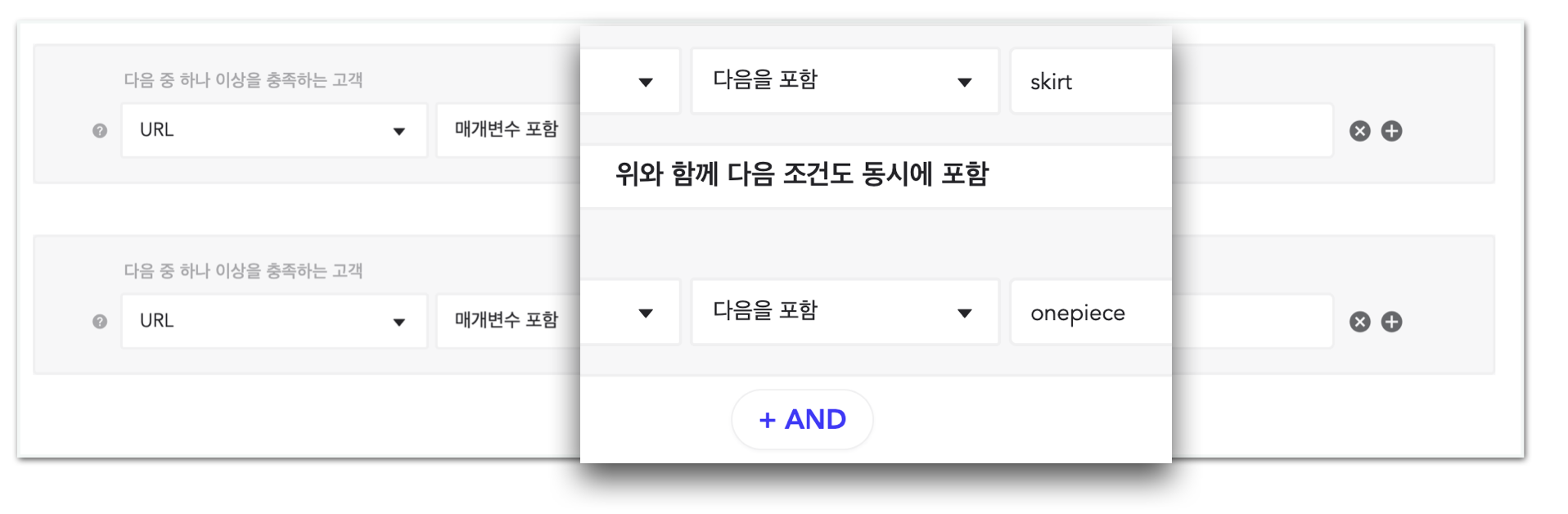 ✔️[case1] 여러 조건을 동시에 만족시키고 싶다면? 예를 들어 여성의류 쇼핑몰의 경우, 스커트 카테고리 중 원피스를 보고있는 사람들에게 타겟을 하고 싶다면 스커트 페이지와 원피스 페이지 모두를 충족시키는 사람에게 타겟을 하기 위해서 AND 조건을 사용할 수 있습니다.