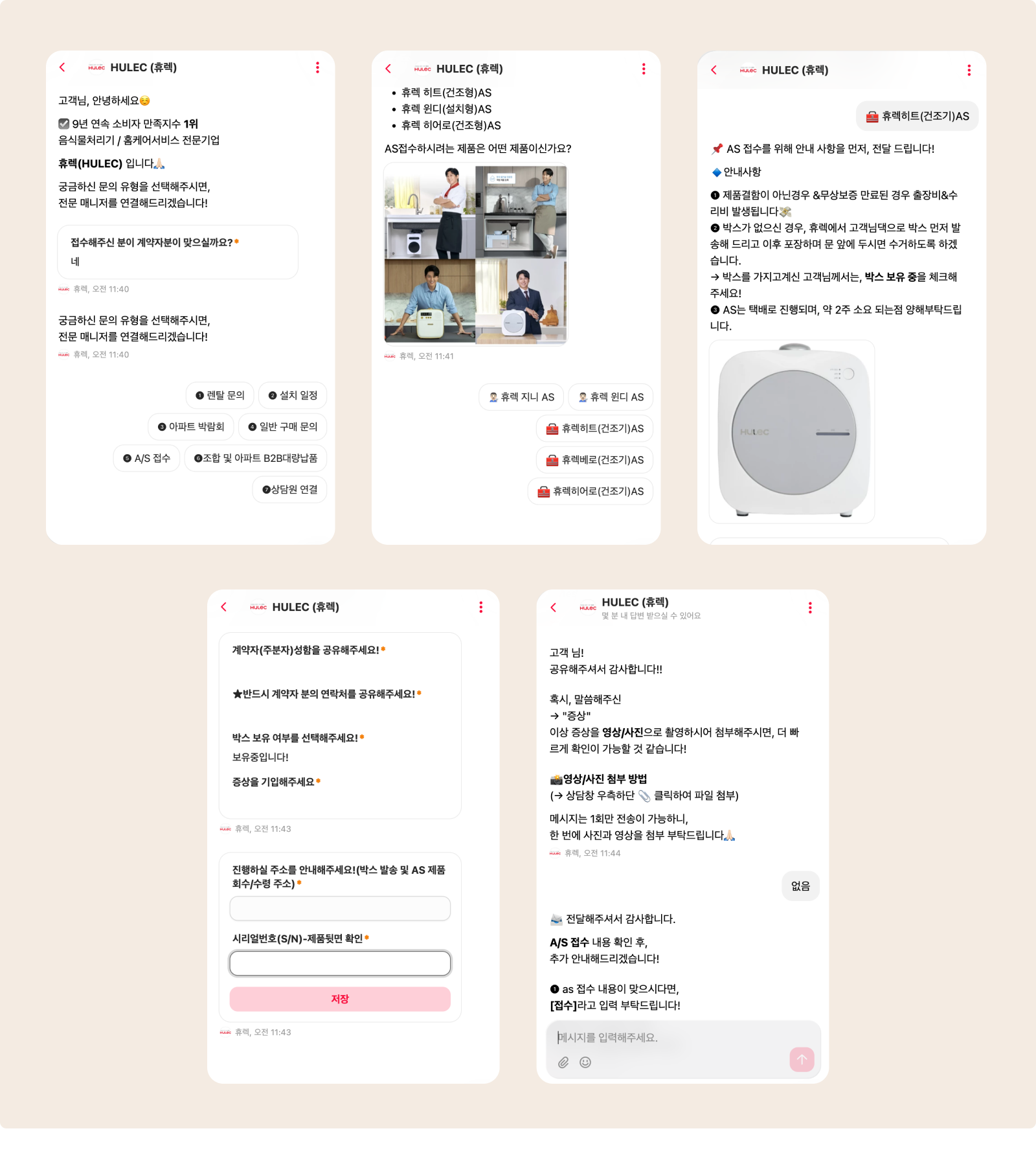 설명: 휴렉은 싱크대 설치형부터 건조형, 시스템형까지 다양한 라인업을 갖춘 음식물 처리기 전문 브랜드입니다. 2021년 매출 71억에서 2025년 320억으로 4배 이상 성장하며 빠르게 시장을 확장하고 있습니다. CS팀은 단순 응대를 넘어 현장 엔지니어 스케줄 조율, 택배 A/S 관리 등 고객 접점 전반을 담당하는 핵심 조직입니다.
