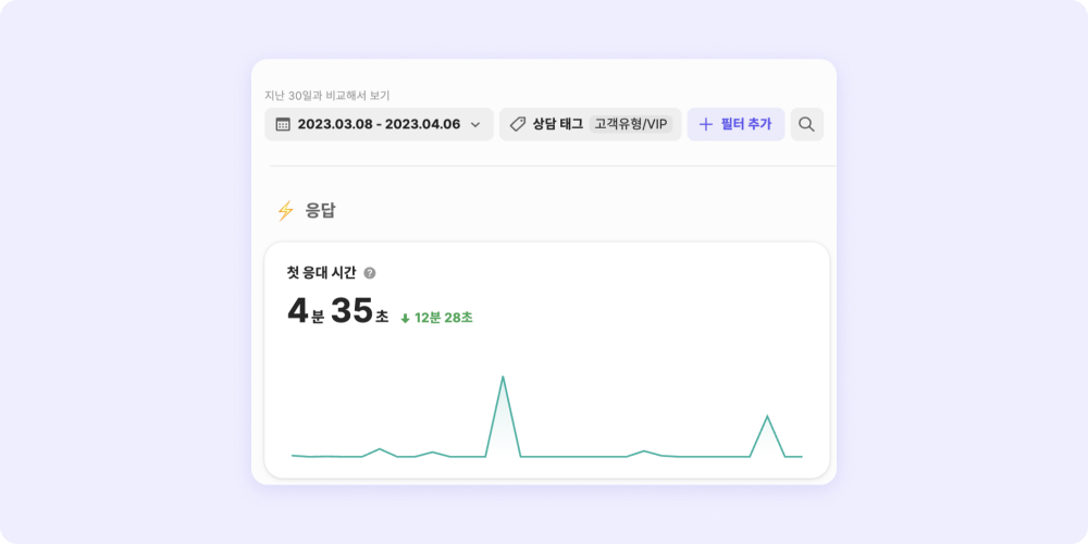 단골은 상담이 시작되었을 때 첫 응대 시간을 5분이 넘지 않게 자동화 규칙을 만들어 두었어요. 단골 응대는 비교적 숙련도가 높은 상담원을 배치하고, 5분동안 고객이 답변을 기다릴 경우 매니저가 알림을 받게 했어요.