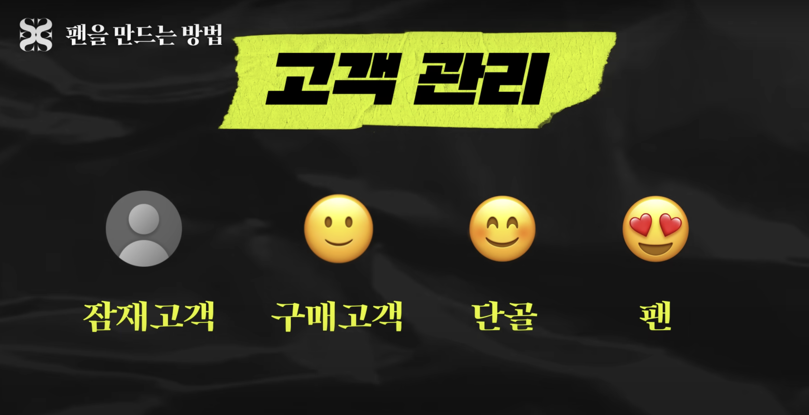 일단은 팬을 만드는 가장 기본은 고객을 분할해서 바라보는 관점이에요. 누군가는 소비자, 누군가는 잠재 고객, 누군가는 한 번 사봤던 고객, 누군가는 단골, 그리고 이 사람은 팬이라고 규정하고 그 고객들의 네 가지 단계를 다 따로따로 전략을 짜서 운영하는 게 핵심이에요.